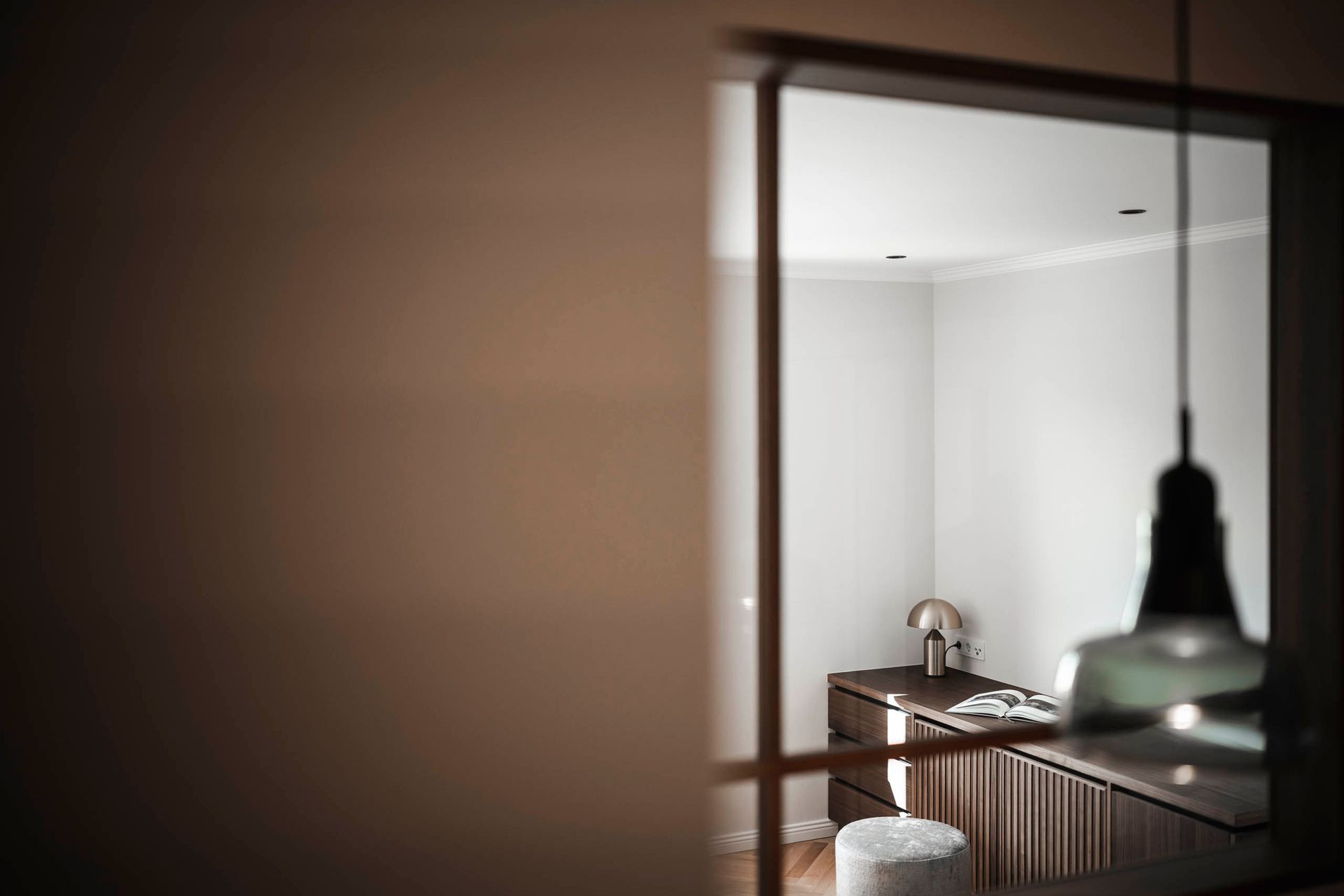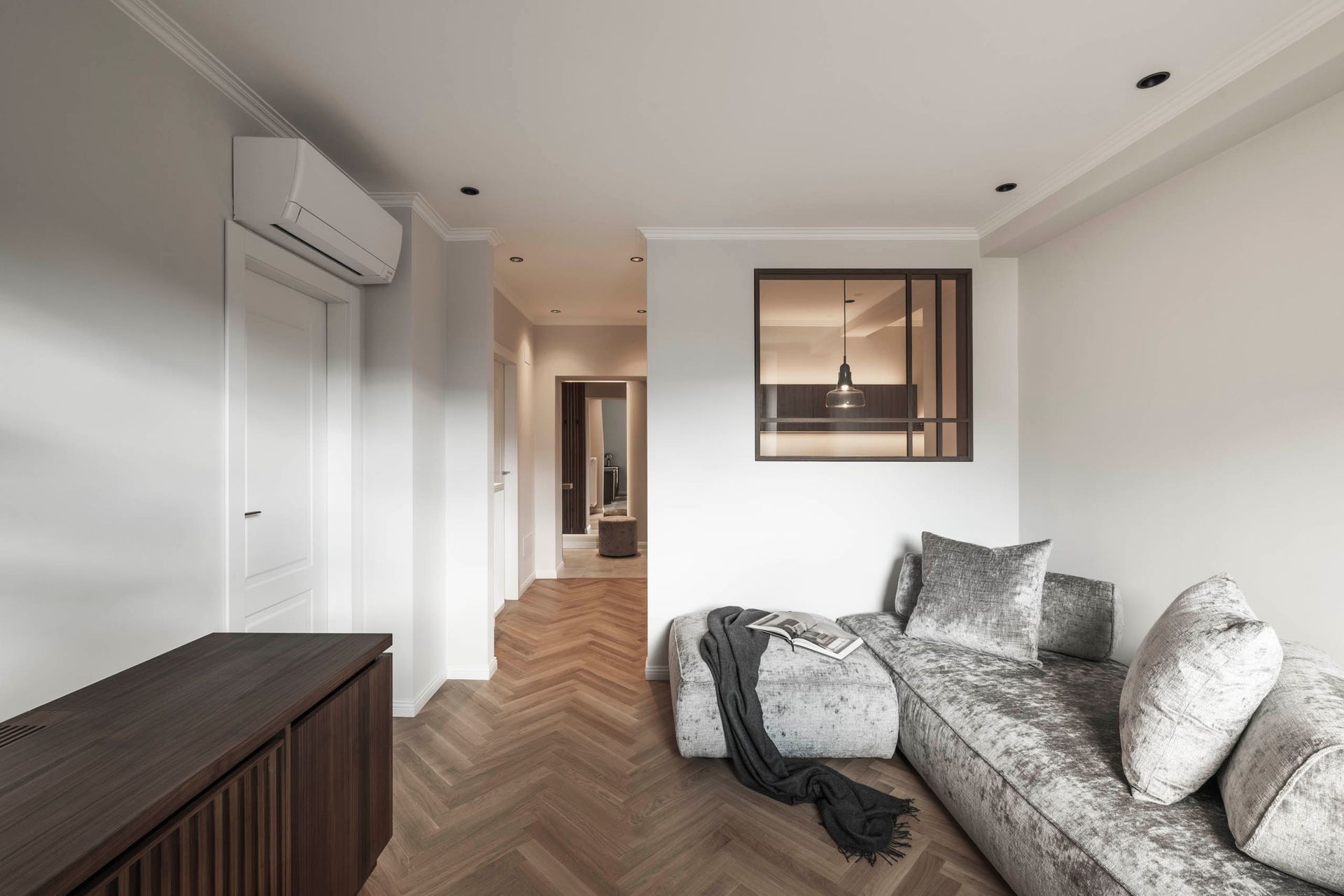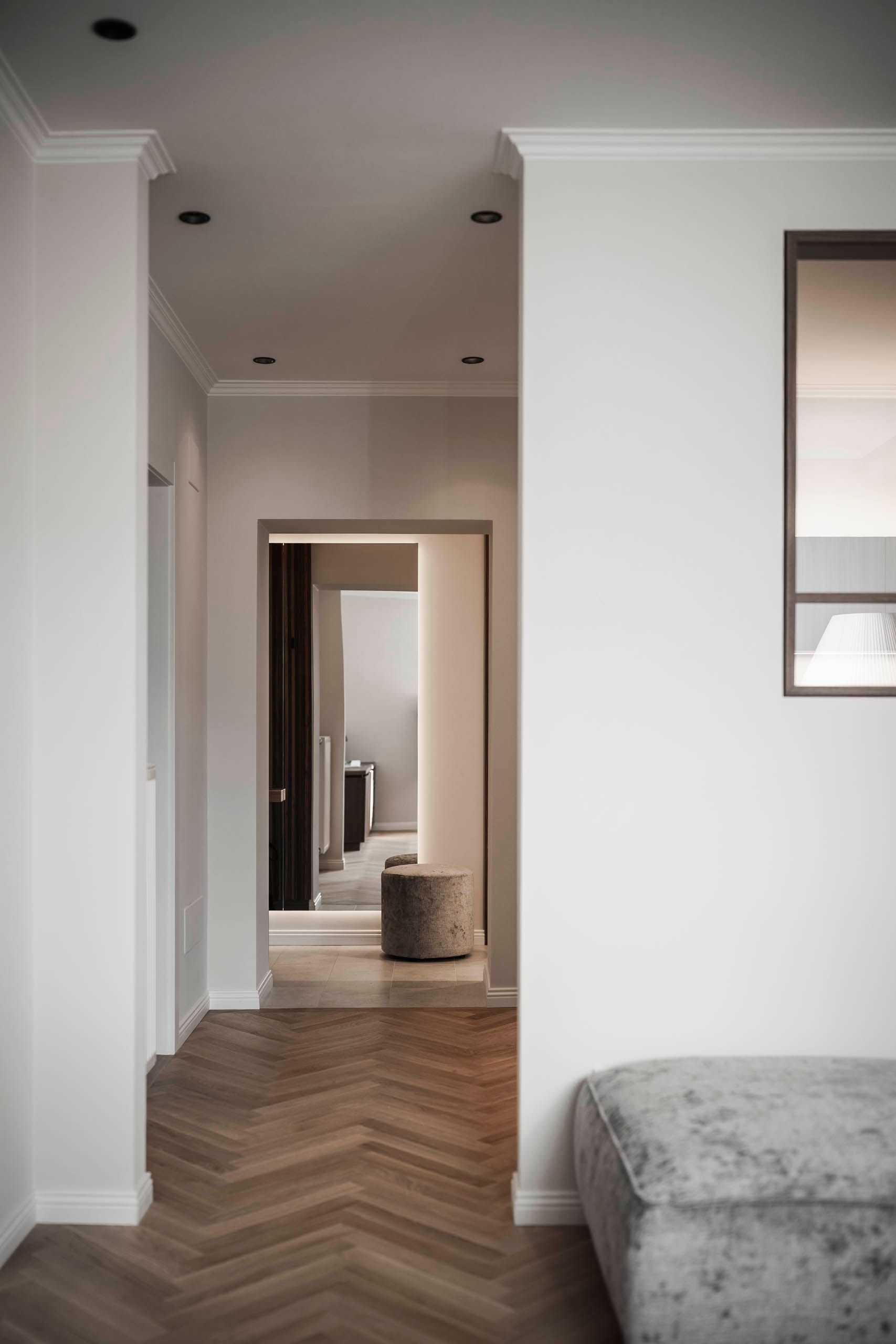 das interior design verbindet klassische eleganz mit zeitgemäßer wohnqualität. feine stuckprofile, ein fischgrätparkett aus eiche und edles nussbaumholz schaffen eine warme, harmonische atmosphäre. hochwertige stoffe und sorgfältig kuratierte beleuchtungselemente setzen stilvolle akzente und verleihen den räumen einen unverwechselbaren charakter.