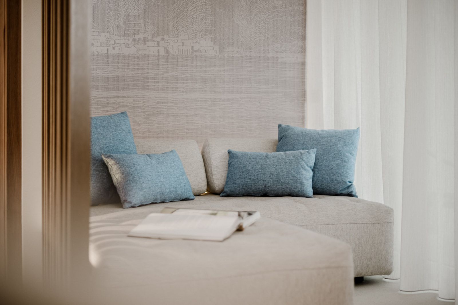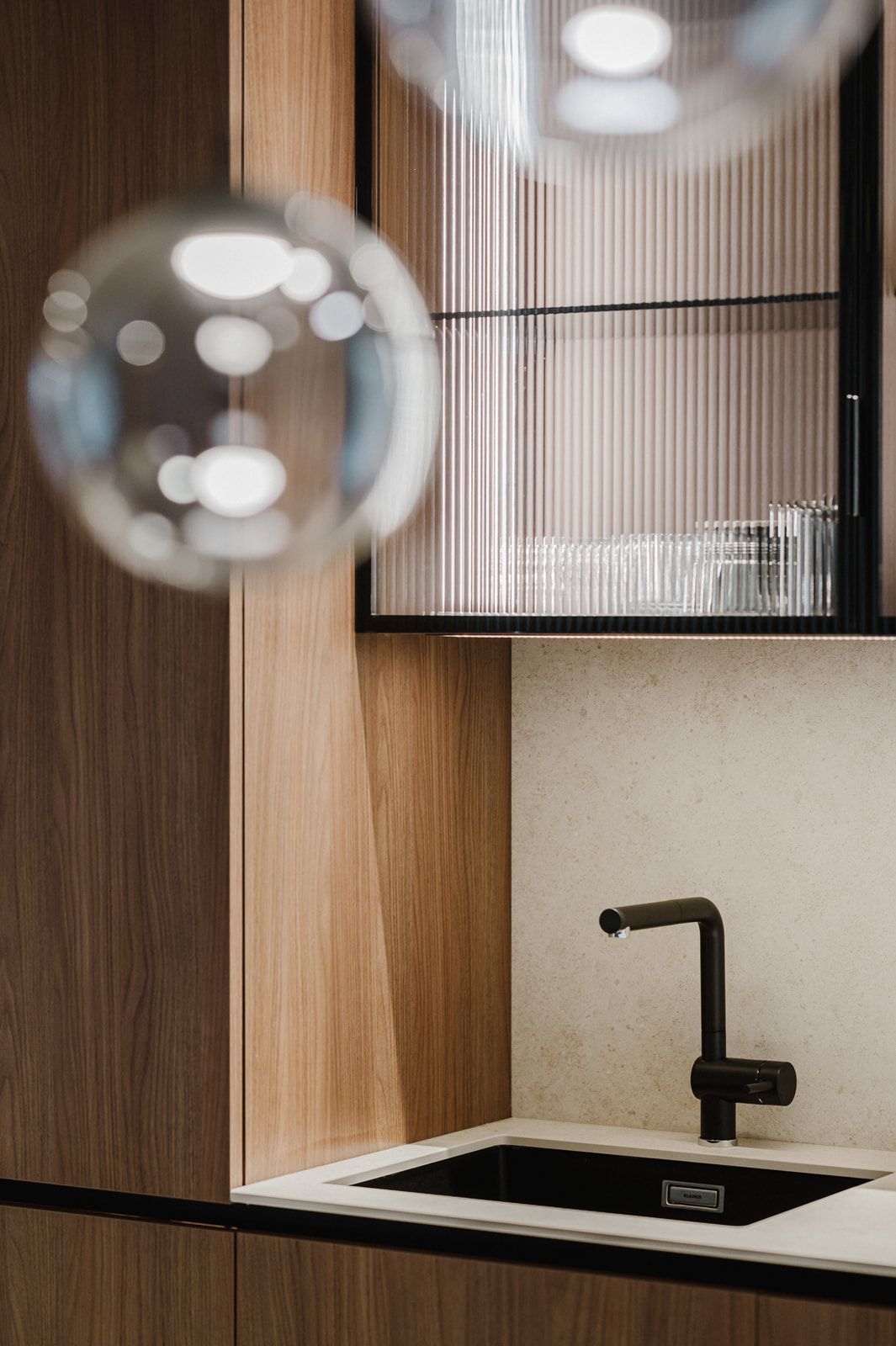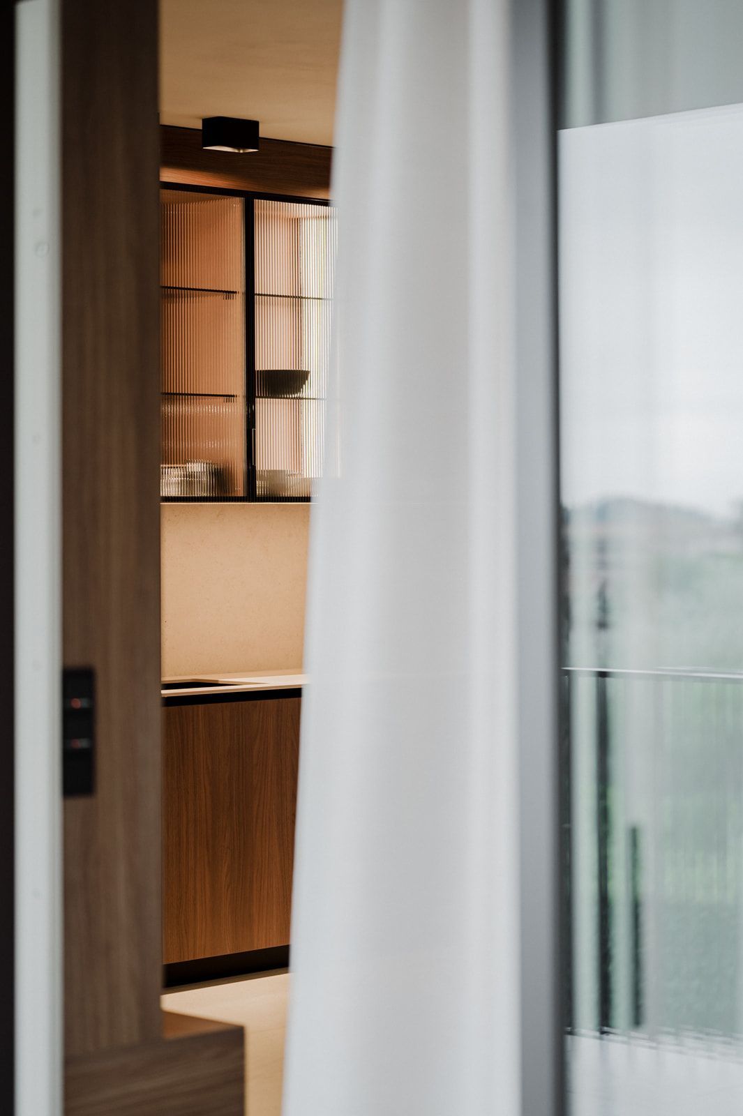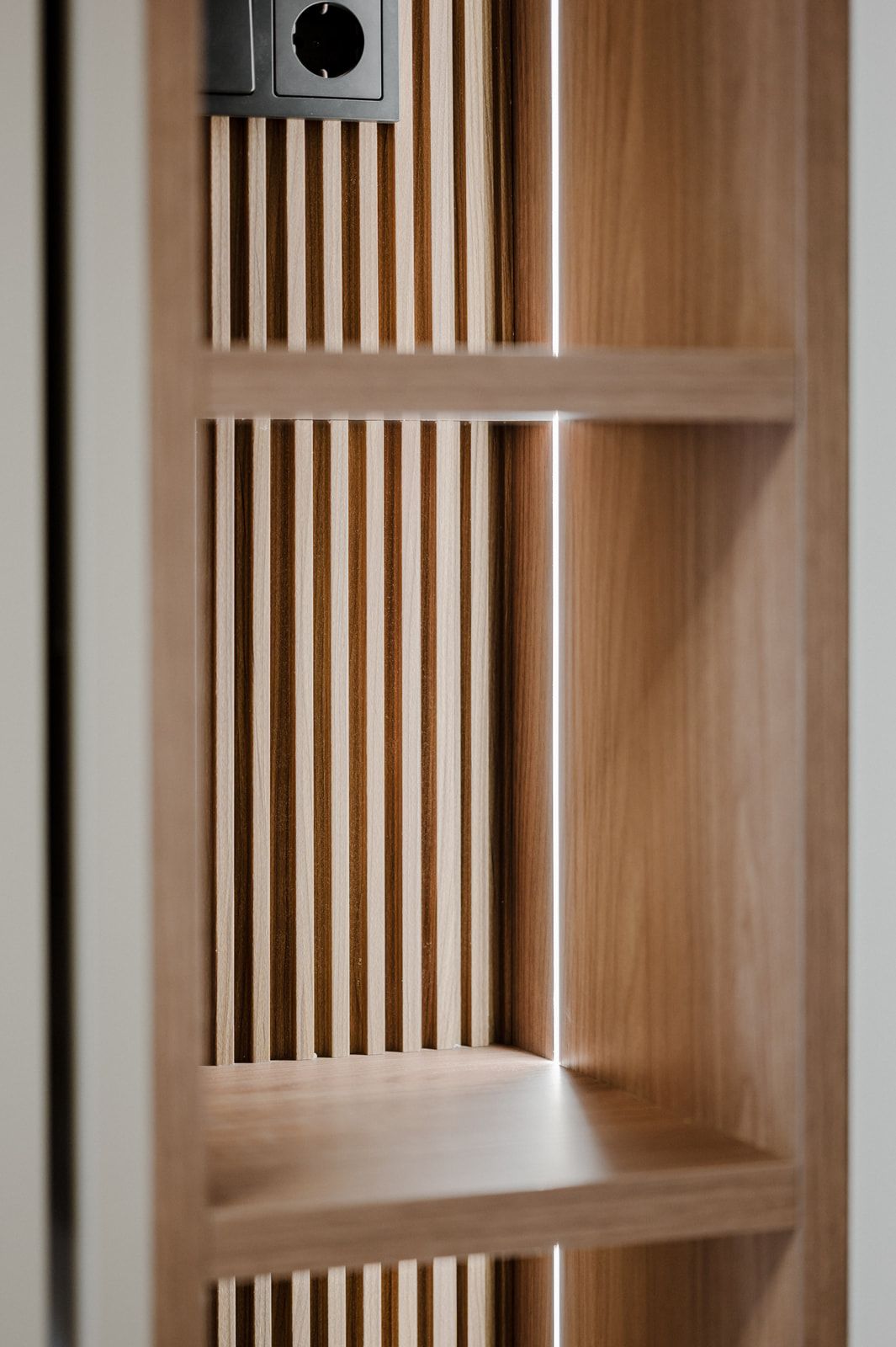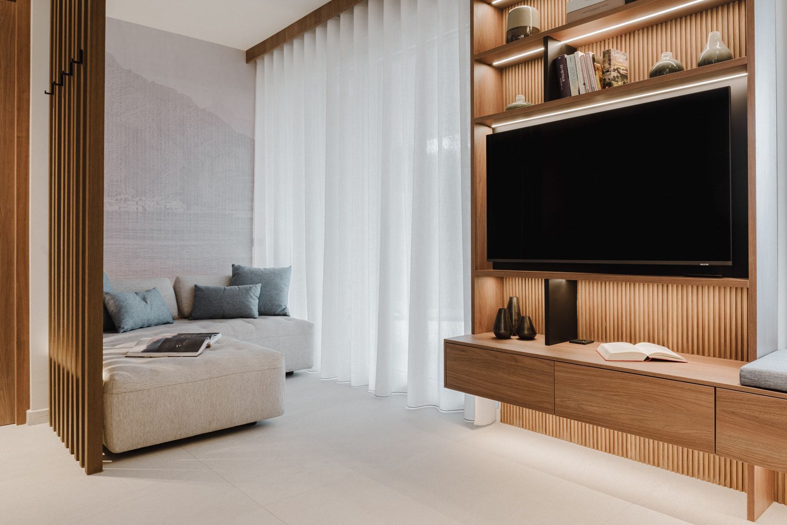...einer ferienwohnung in edlem nussholz gepaart mit travertinstein und sommerlichen blautönen