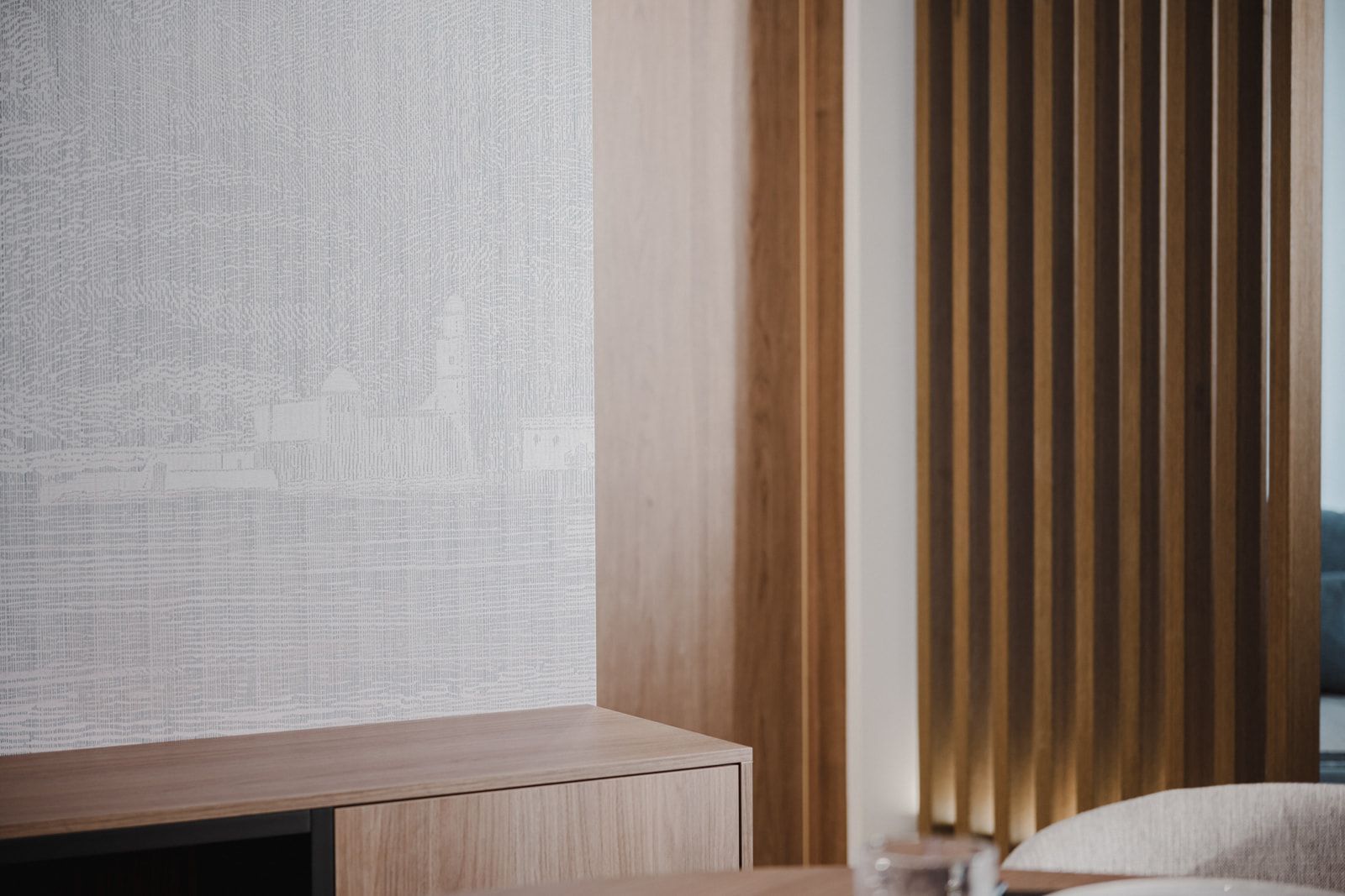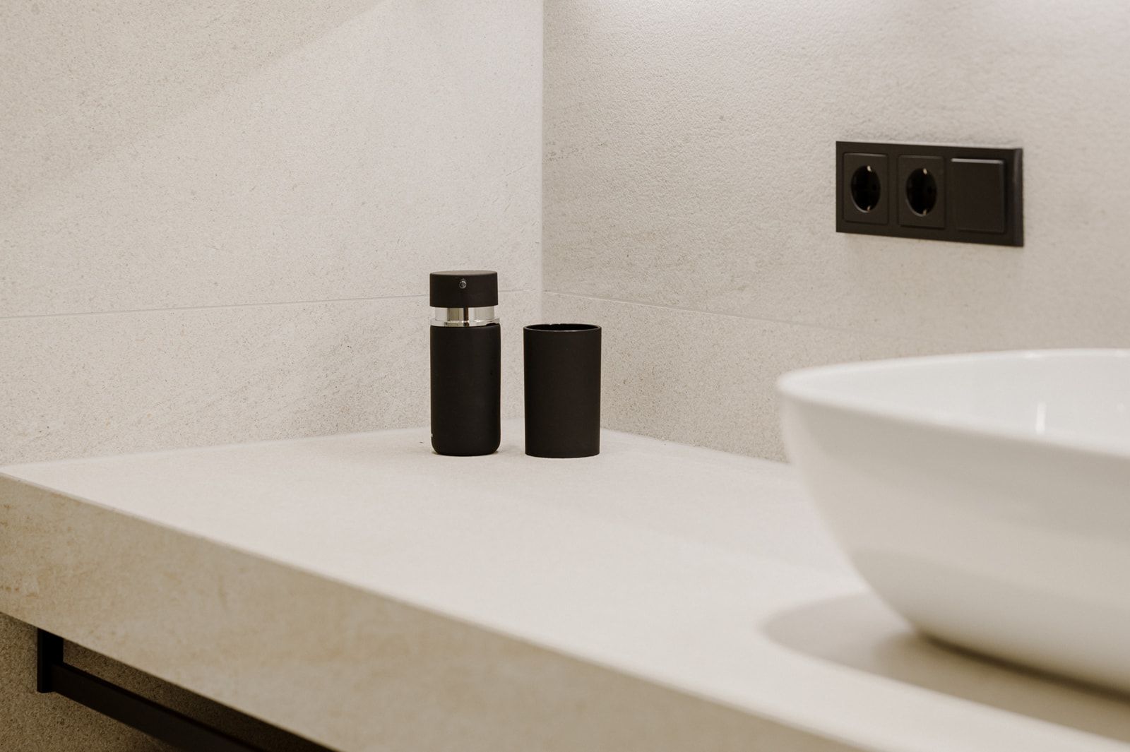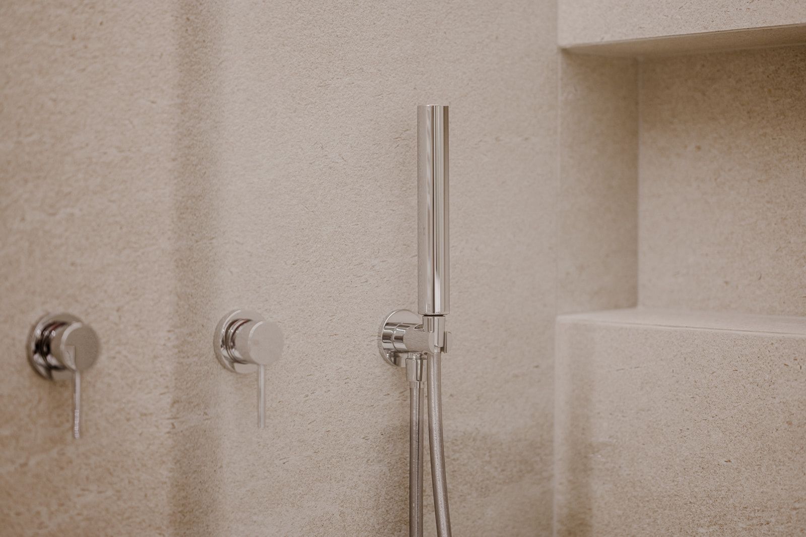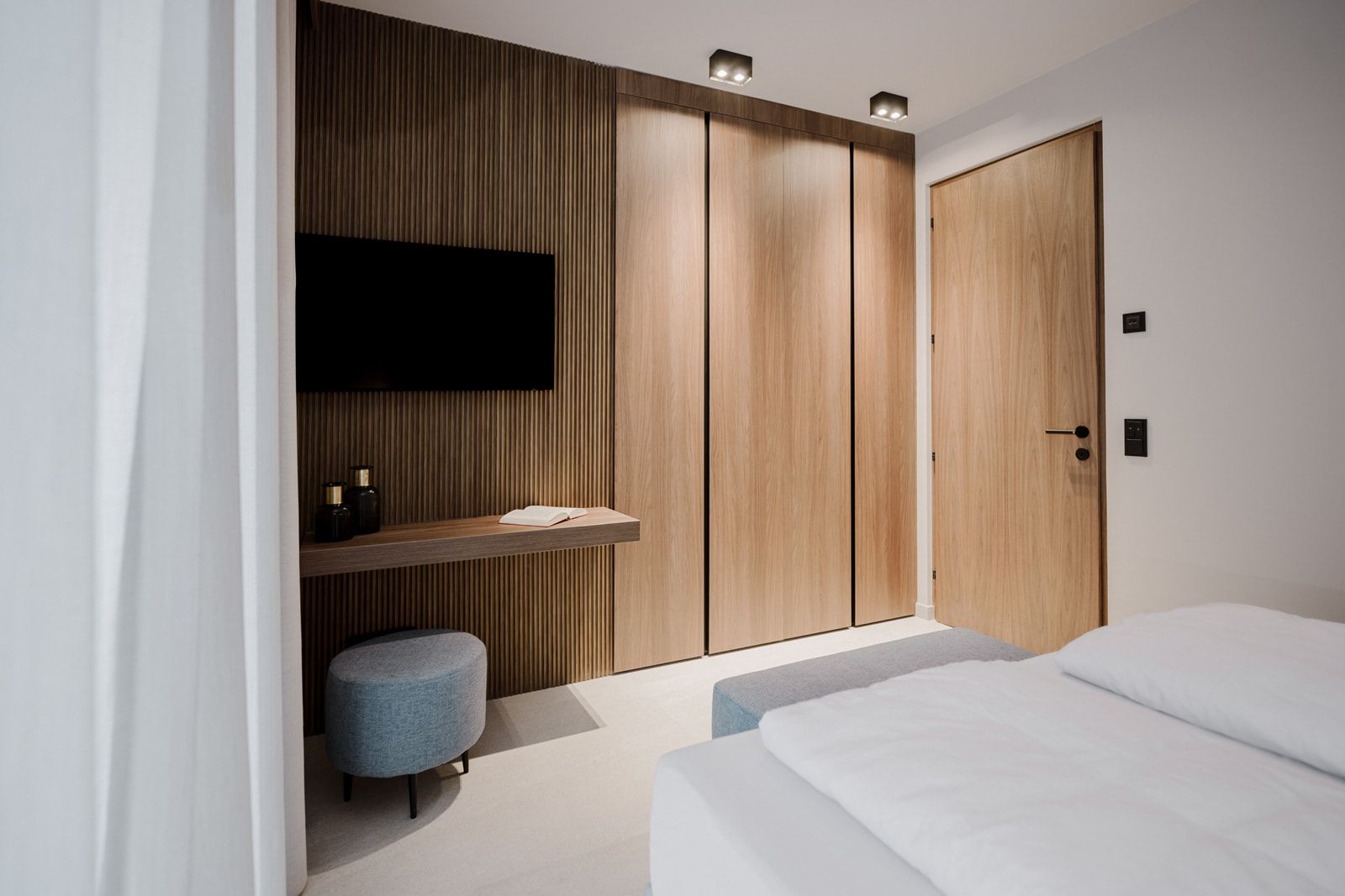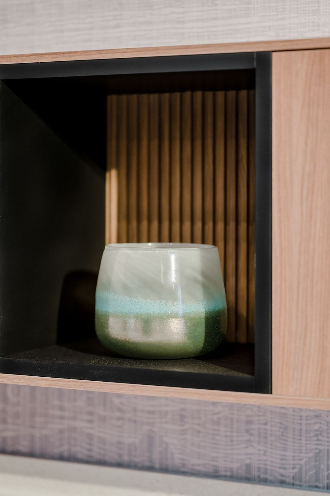 ...einer ferienwohnung in edlem nussholz gepaart mit travertinstein und sommerlichen blautönen