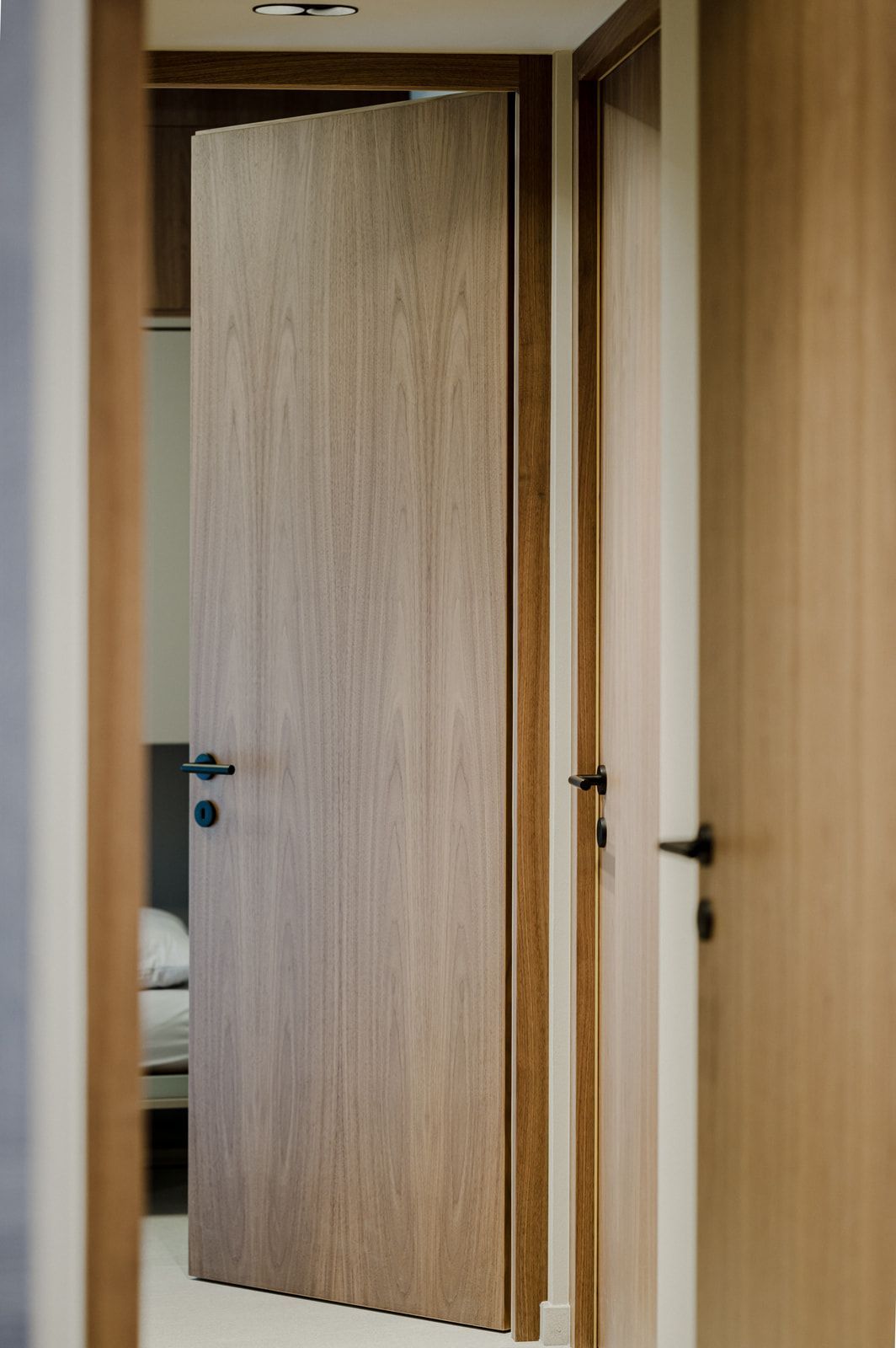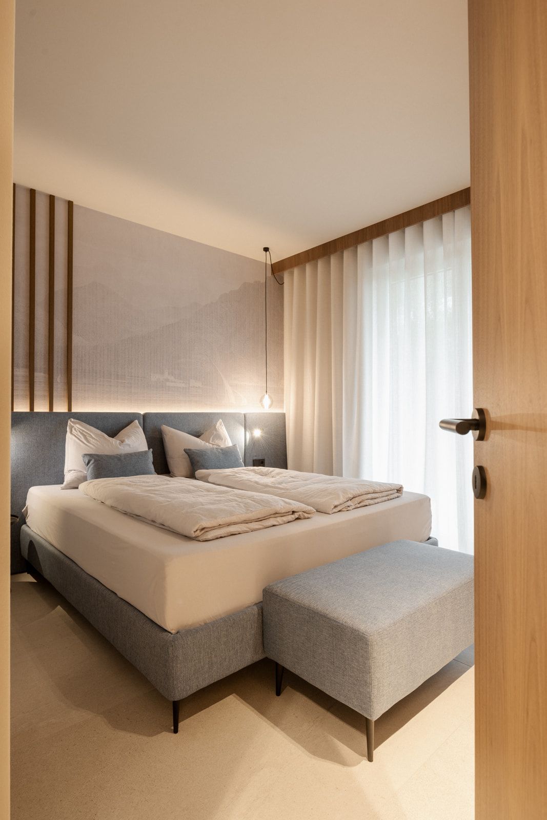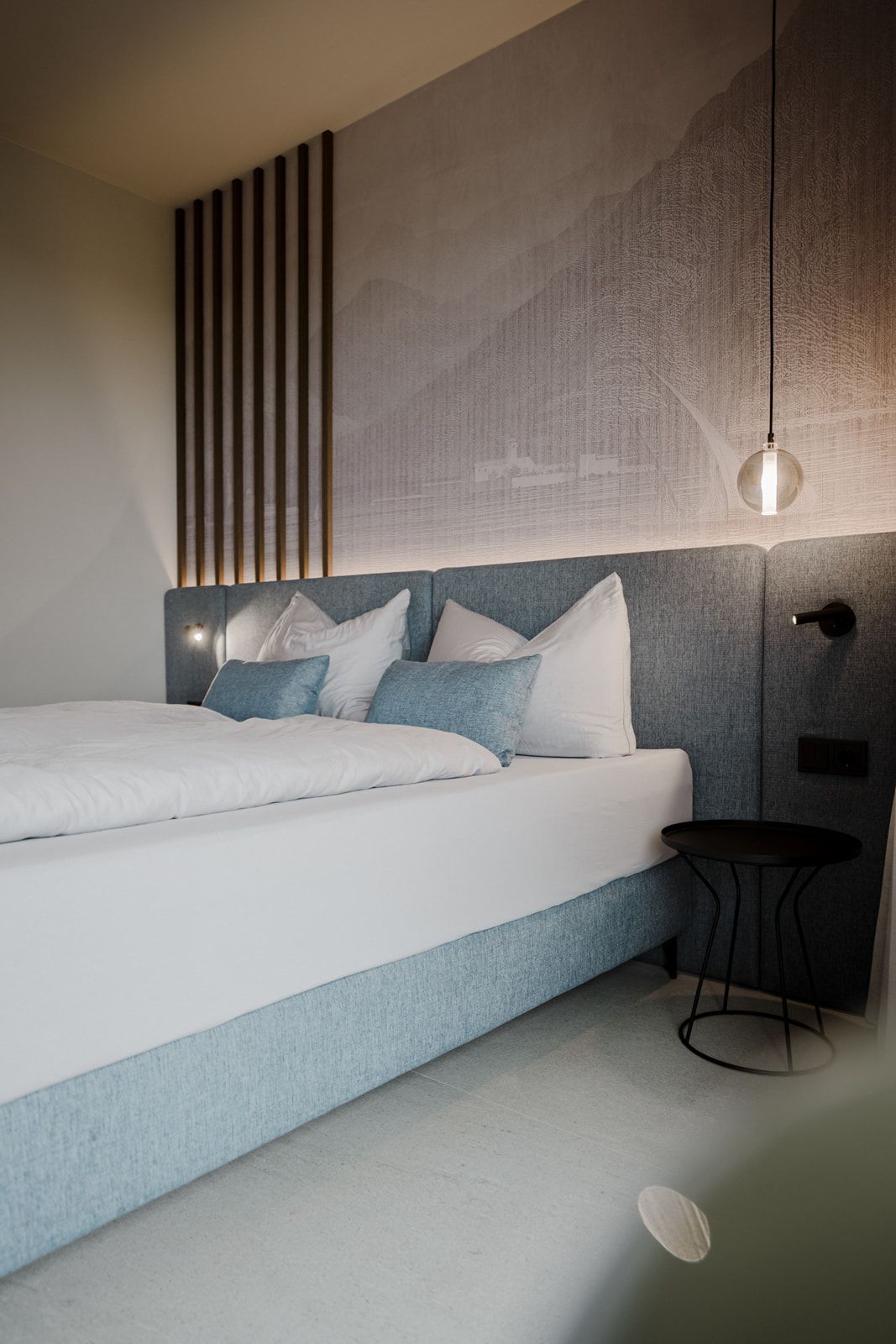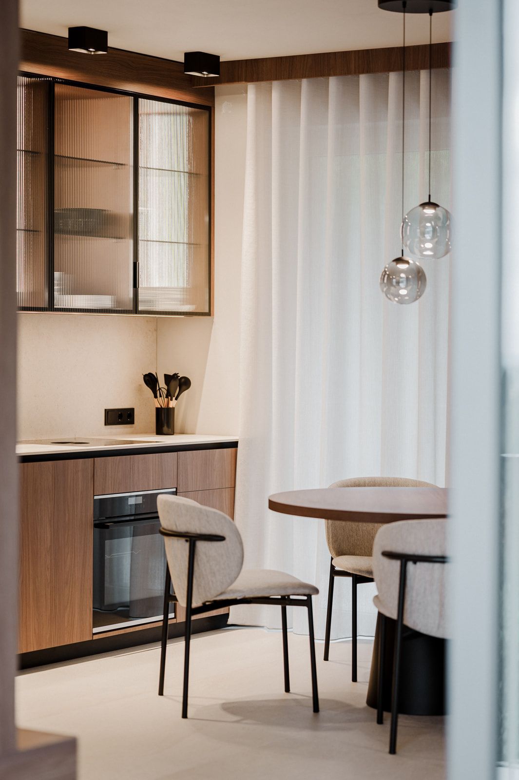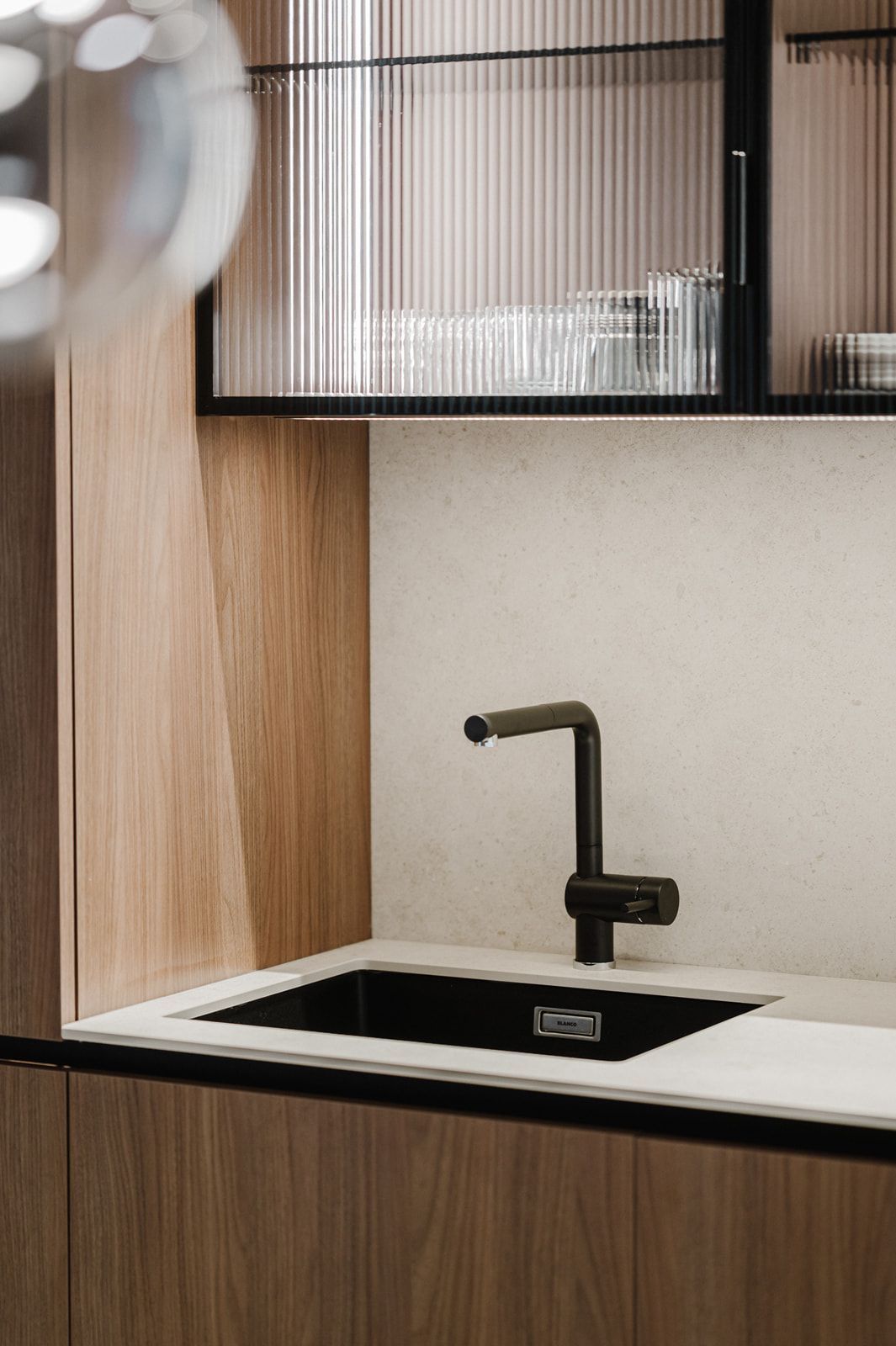 ...einer ferienwohnung in edlem nussholz gepaart mit travertinstein und sommerlichen blautönen