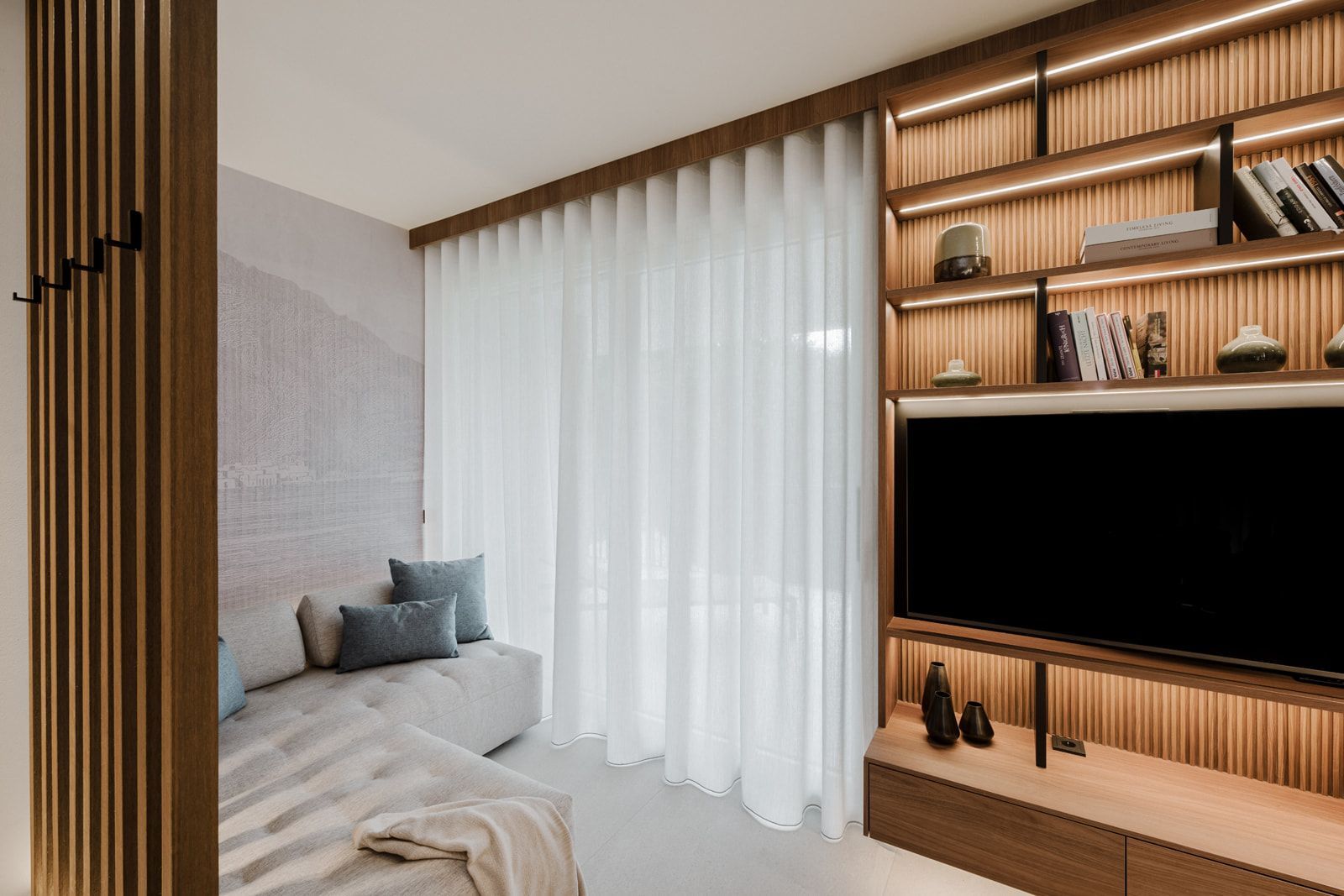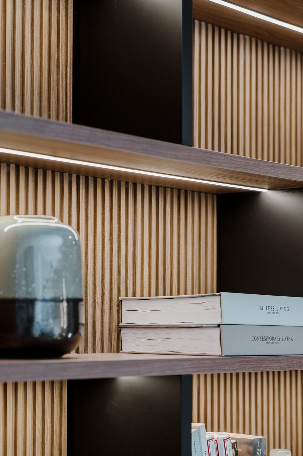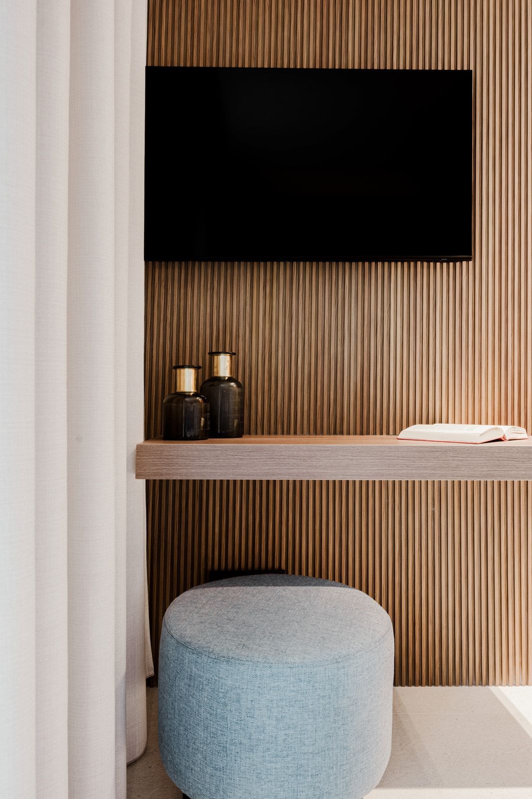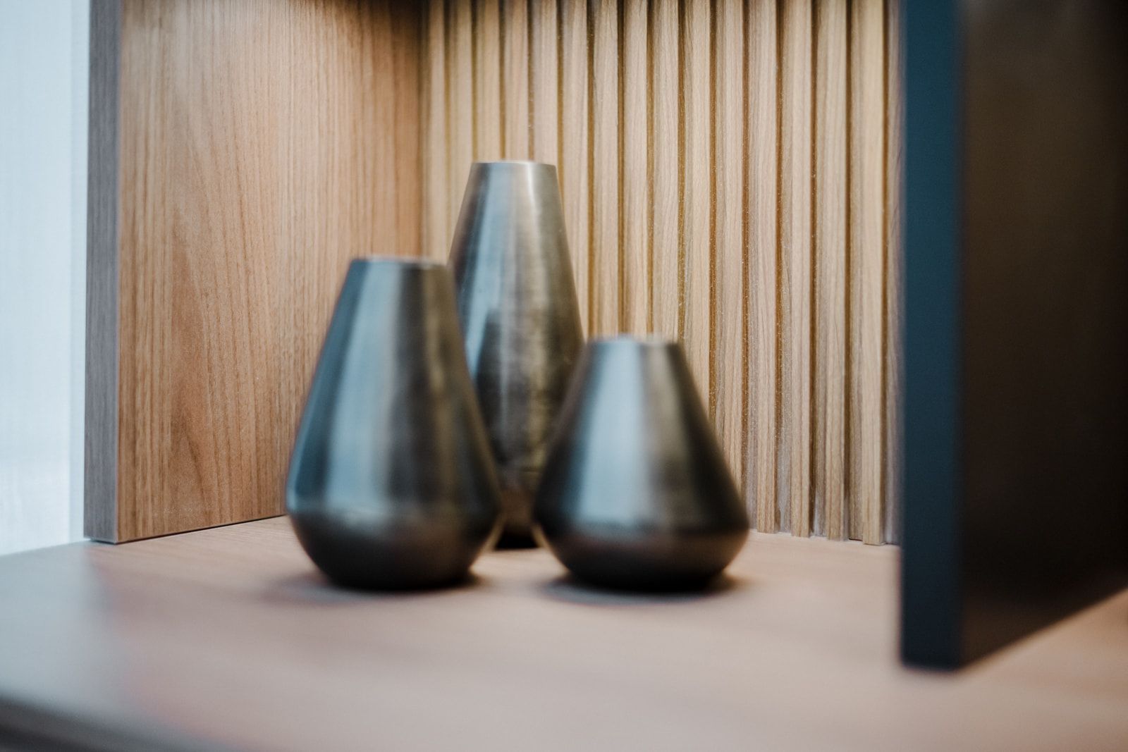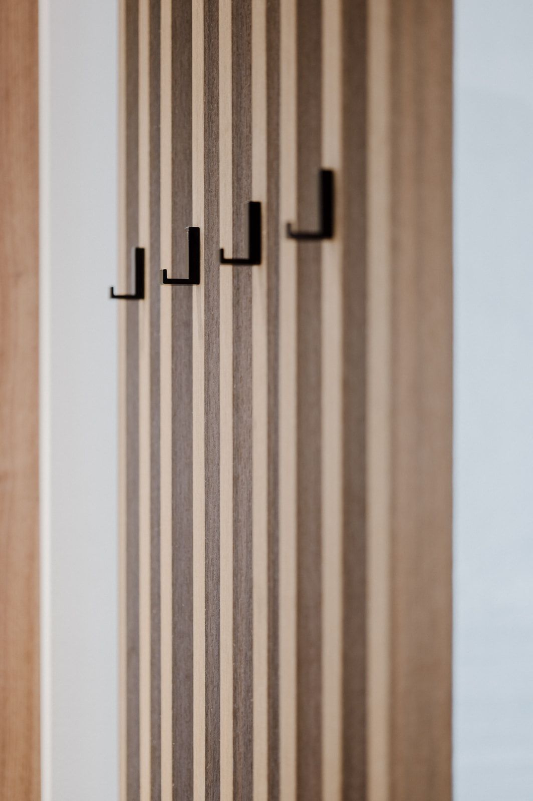 ...einer ferienwohnung in edlem nussholz gepaart mit travertinstein und sommerlichen blautönen
