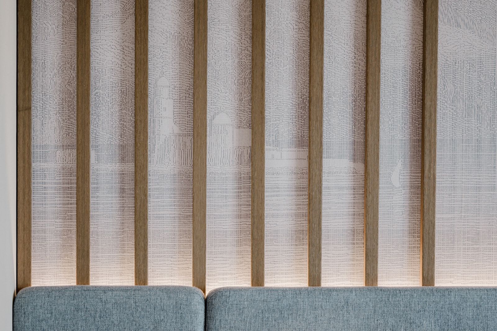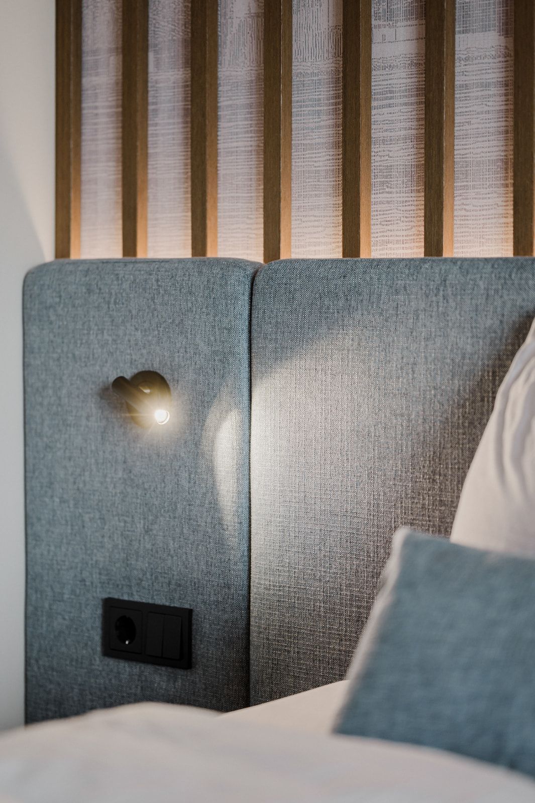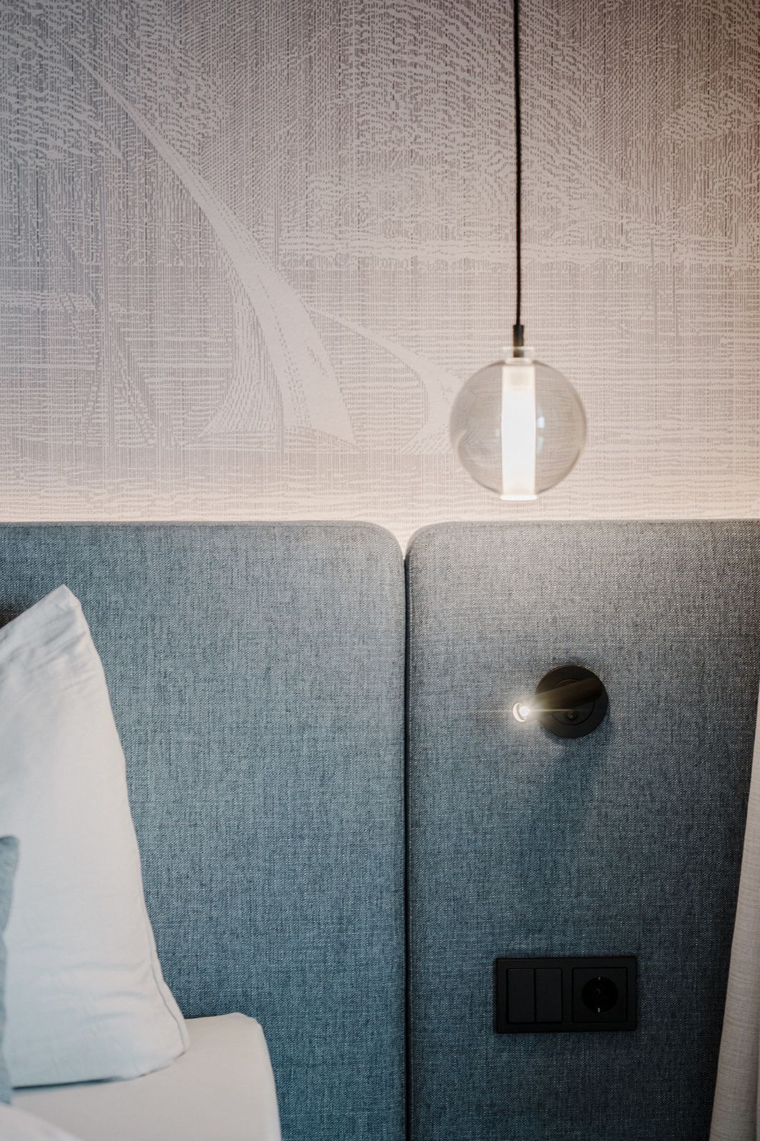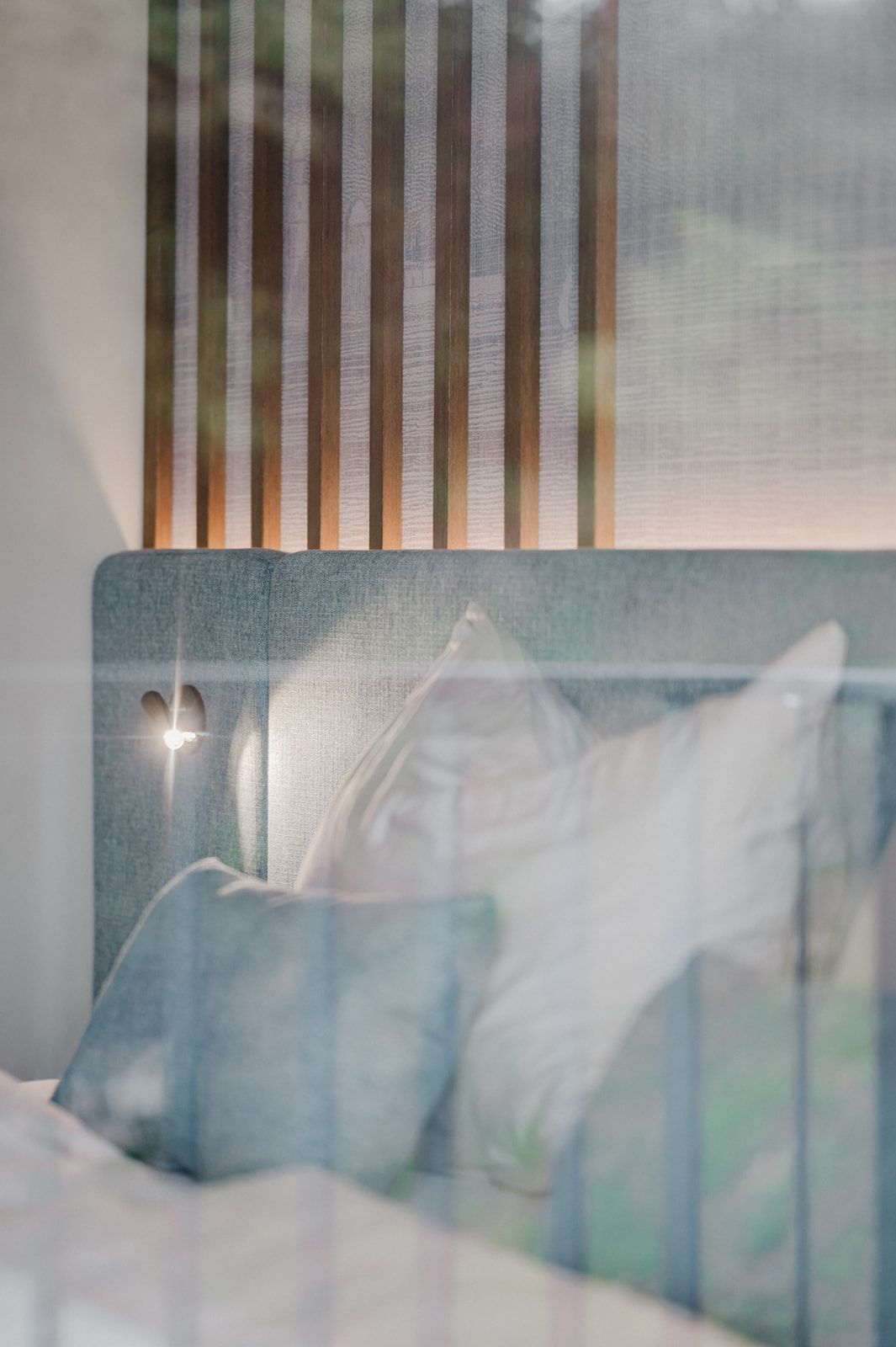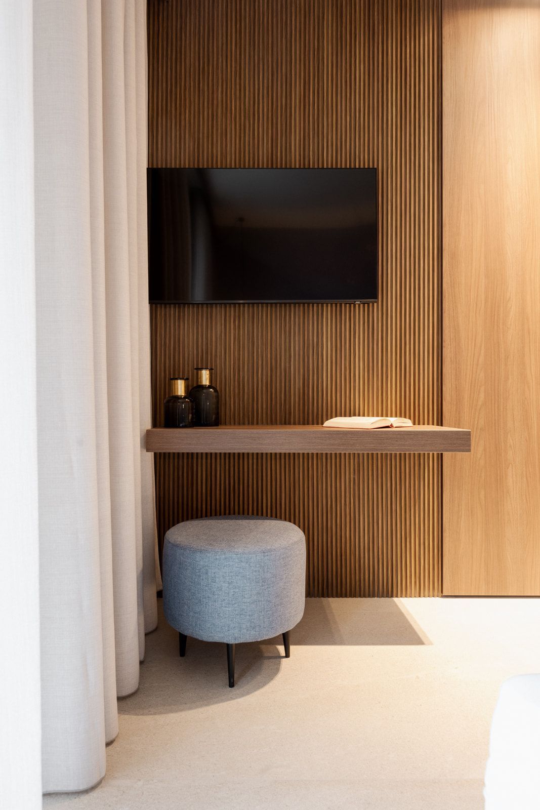 ...einer ferienwohnung in edlem nussholz gepaart mit travertinstein und sommerlichen blautönen