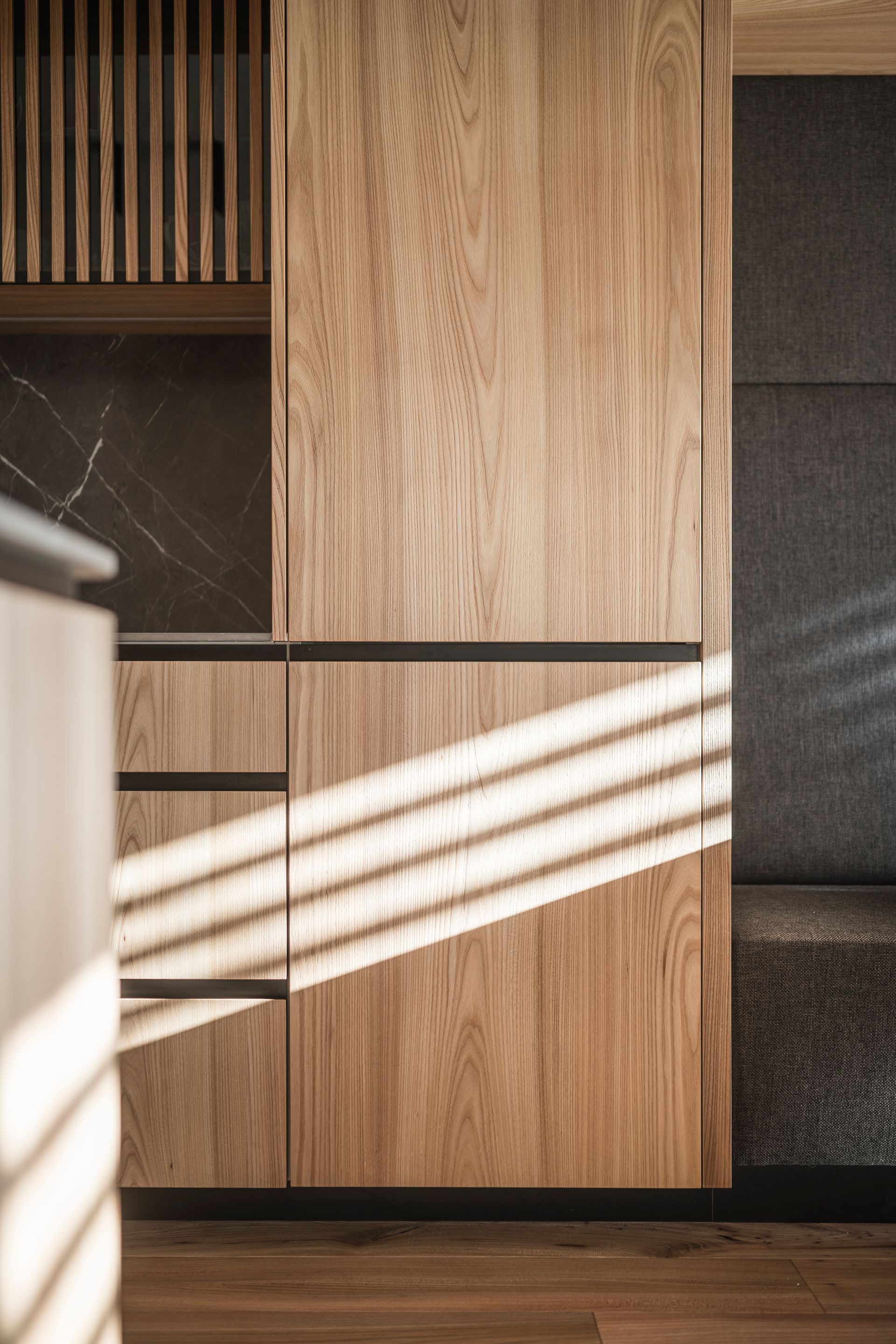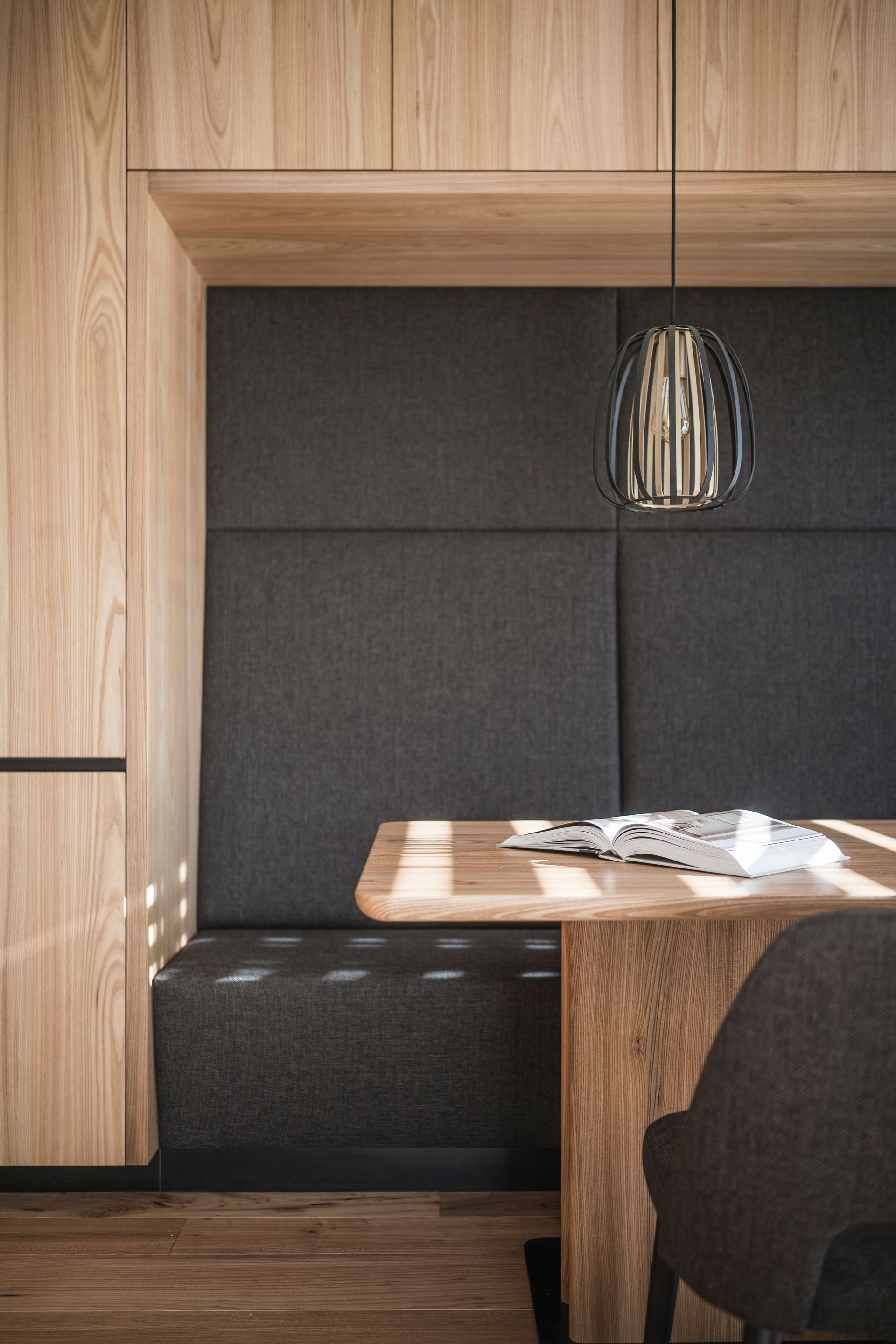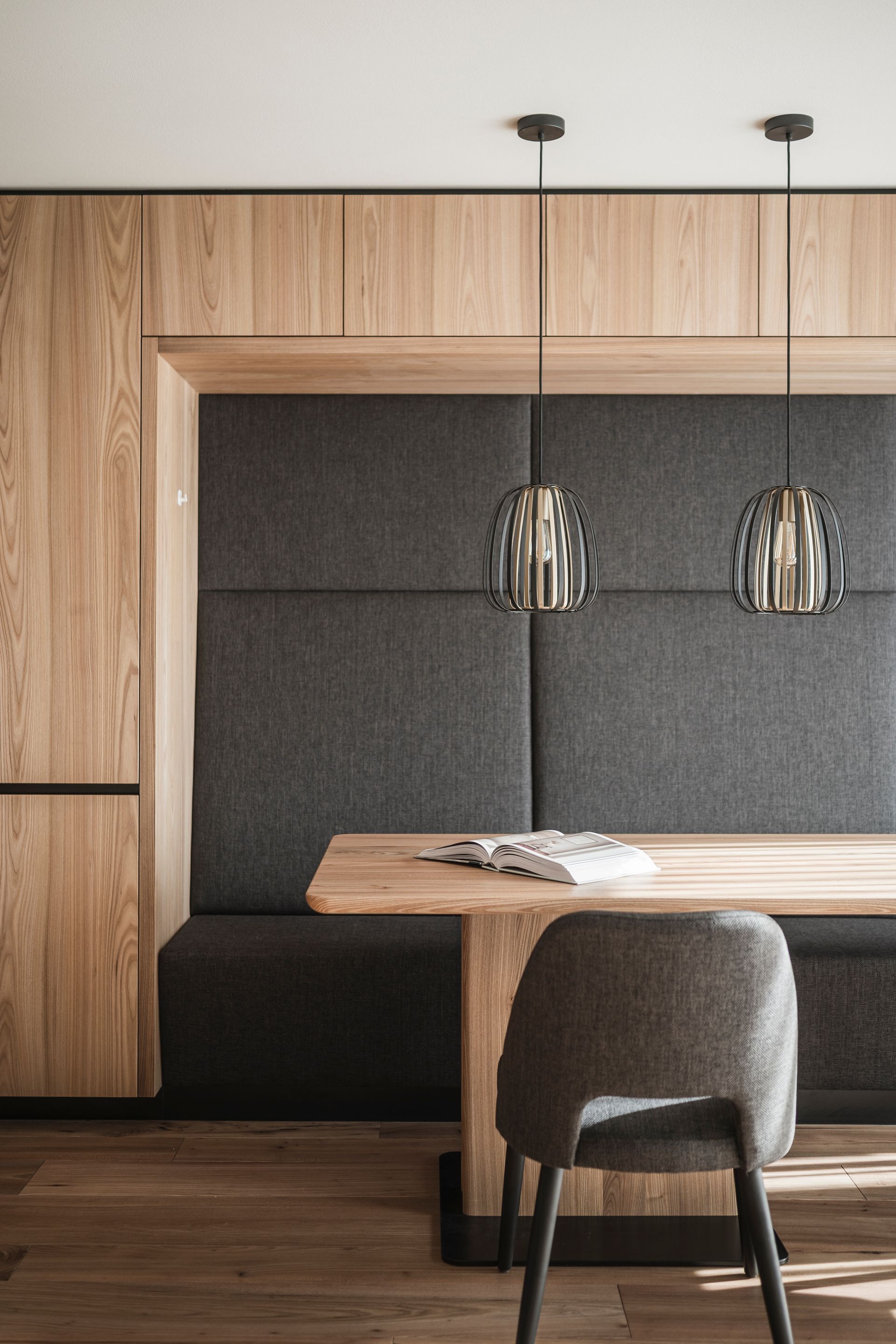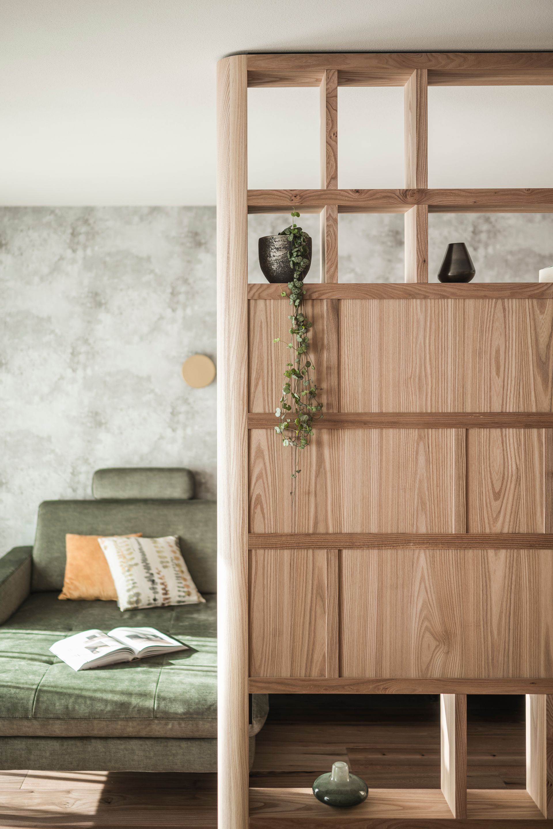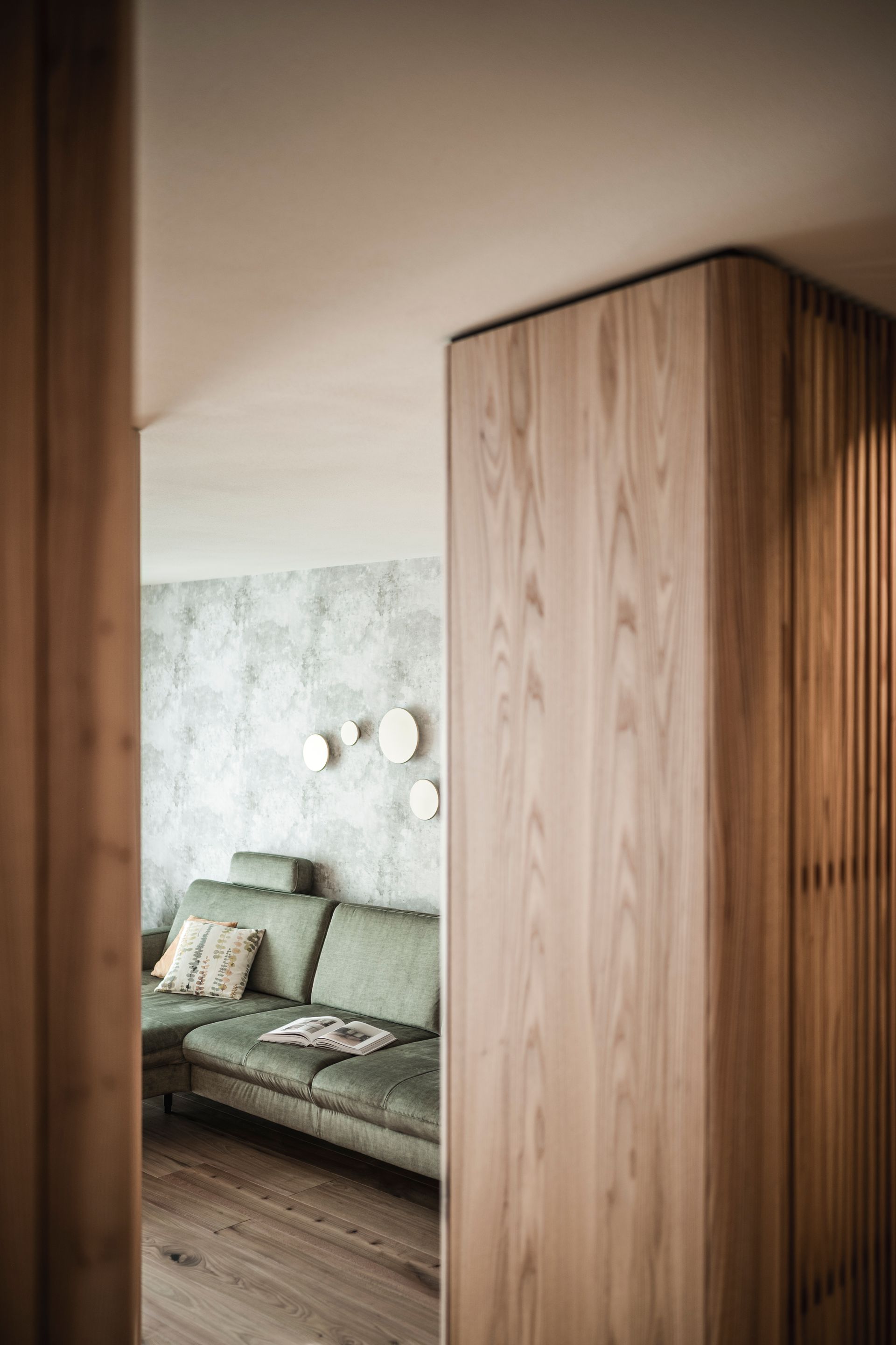 ...interior design einer privatwohnung in ulmenholz, in kombination mit edlen textilien in grau und goldelementen.