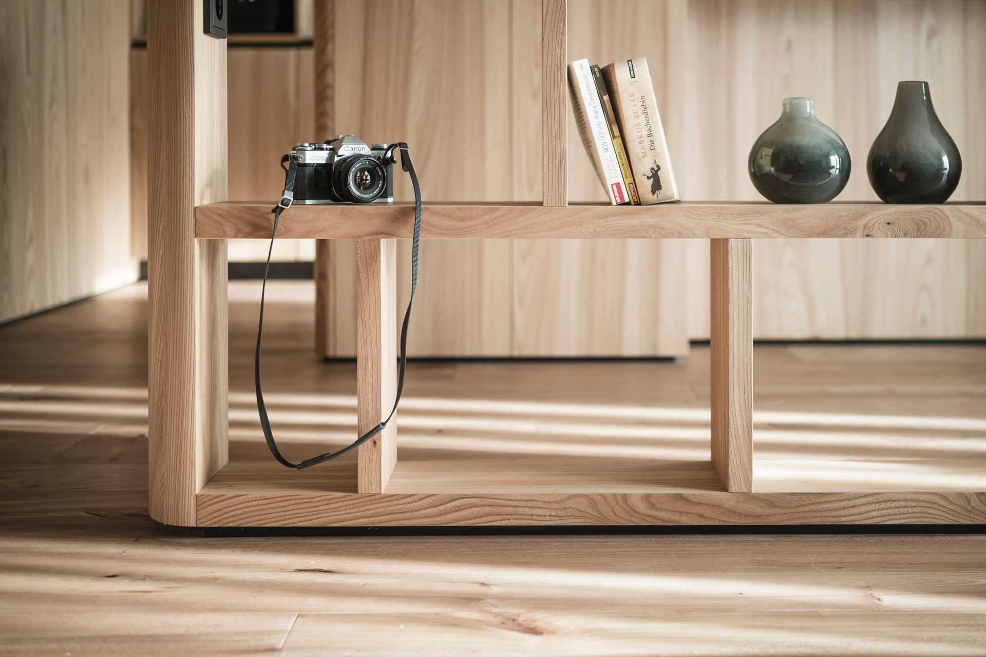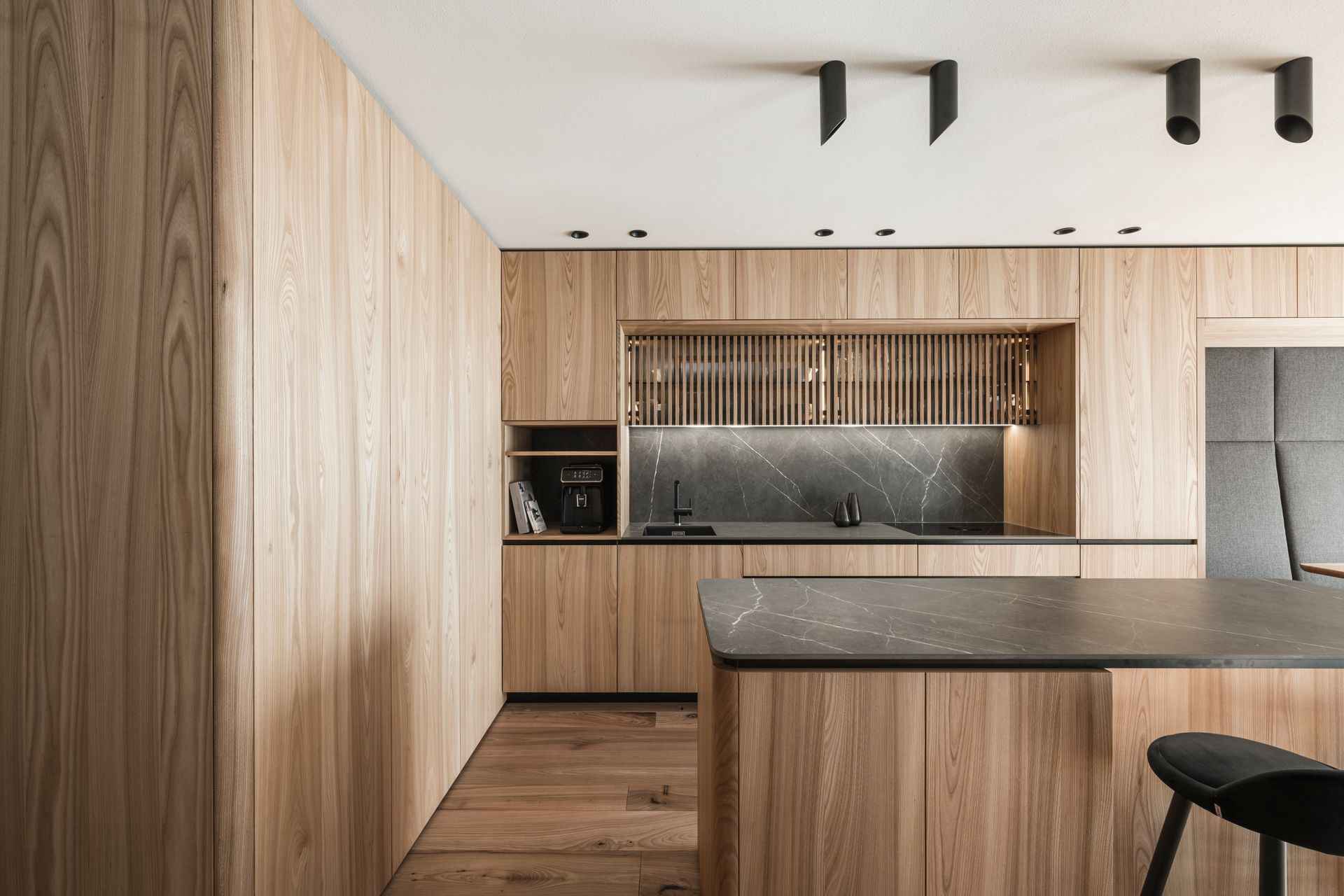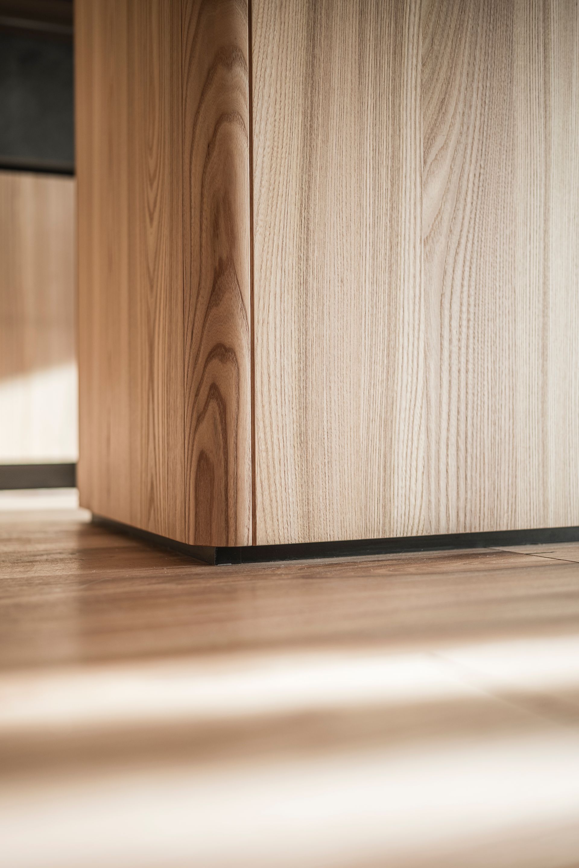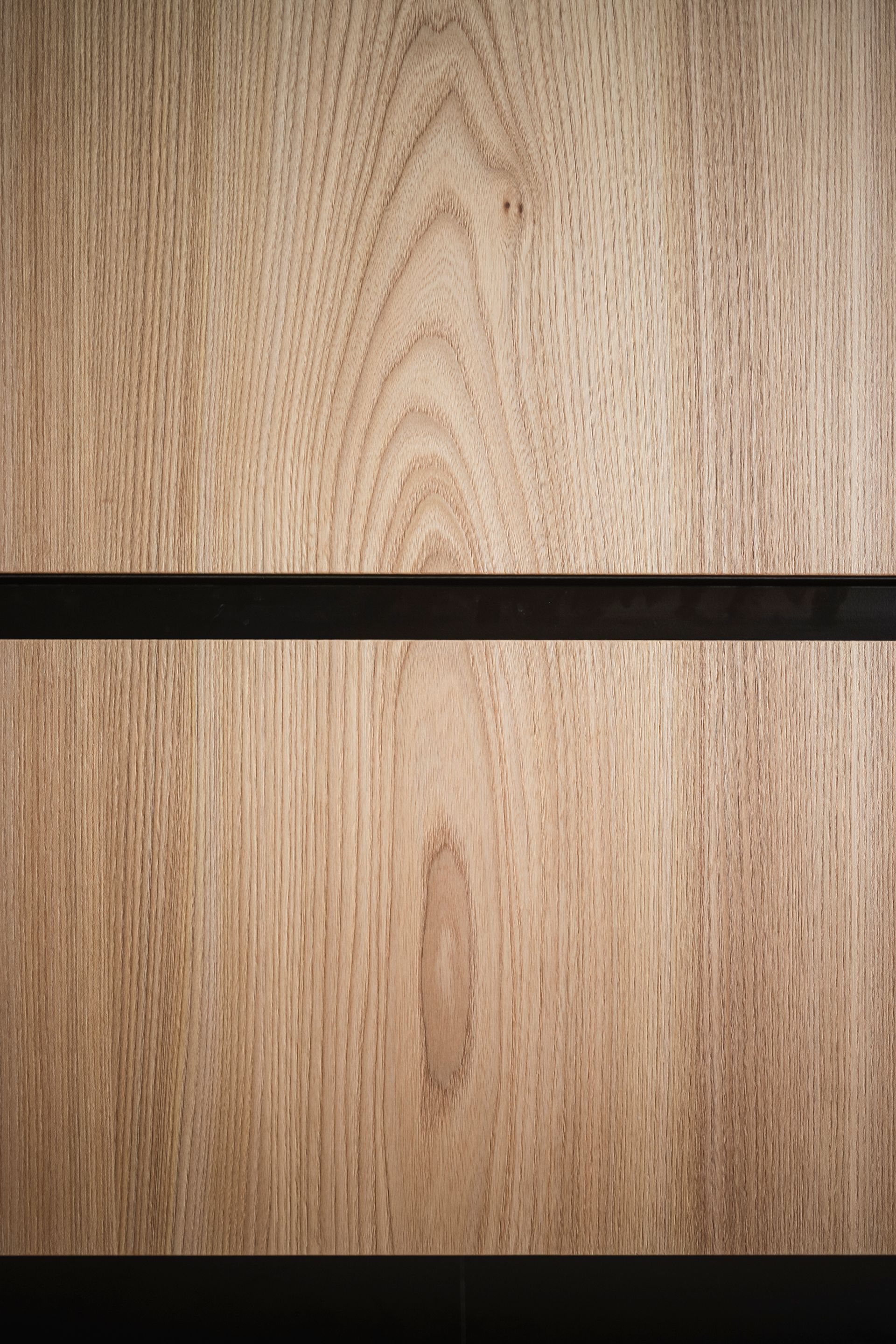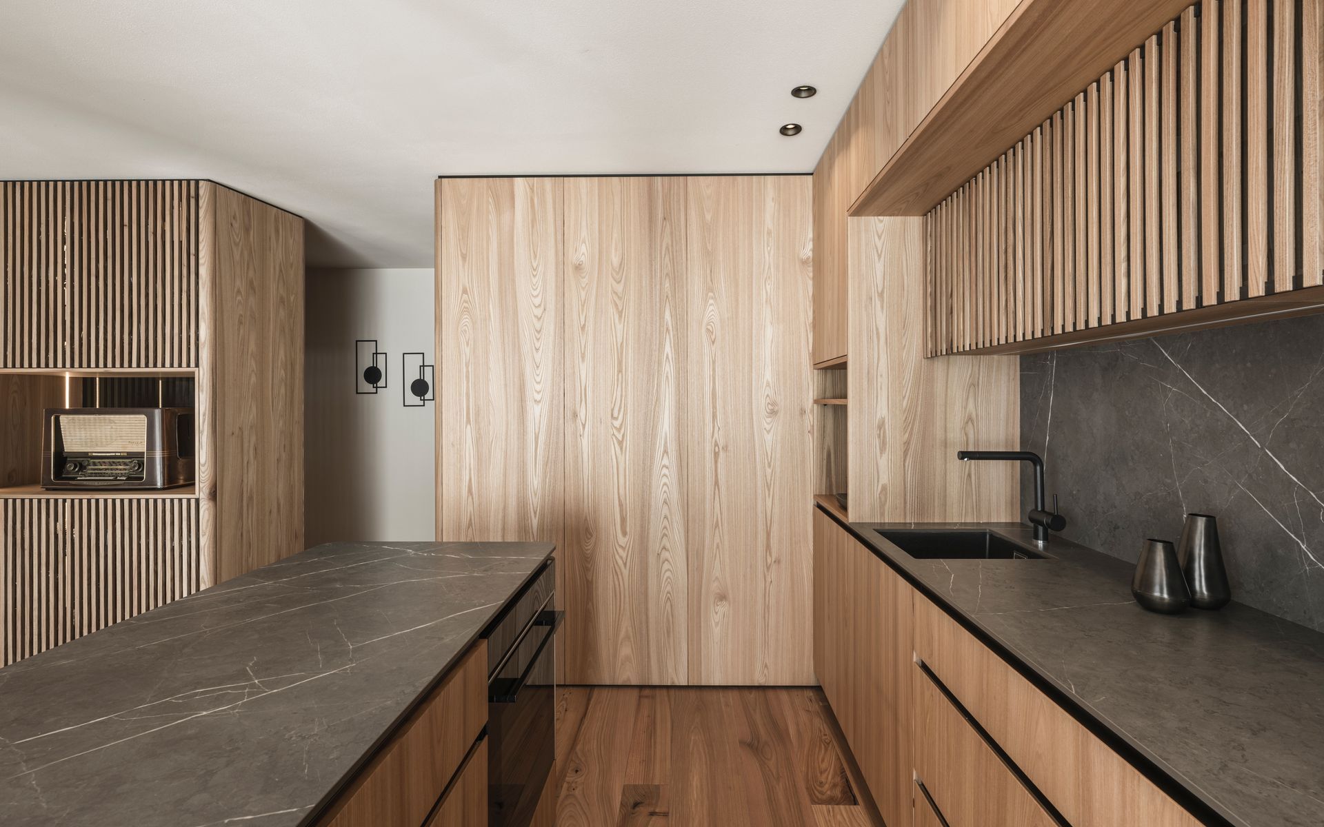 ...interior design einer privatwohnung in ulmenholz, in kombination mit edlen textilien in grau und goldelementen.