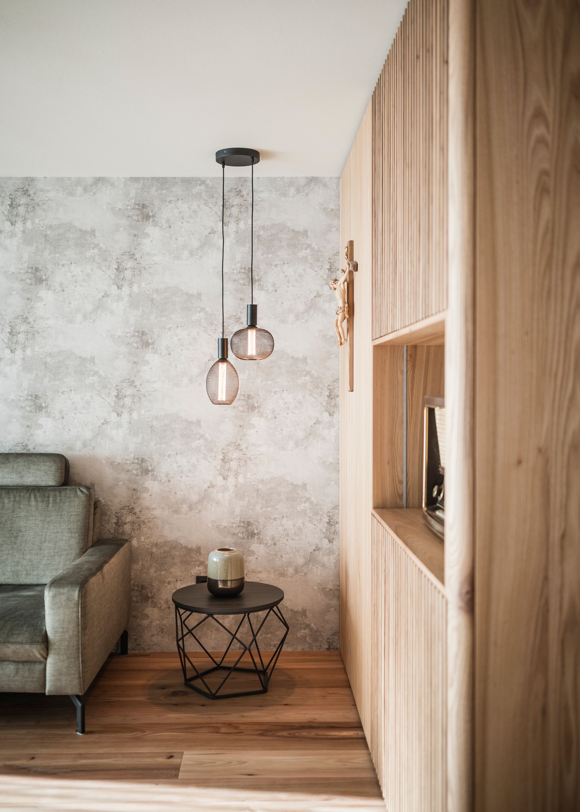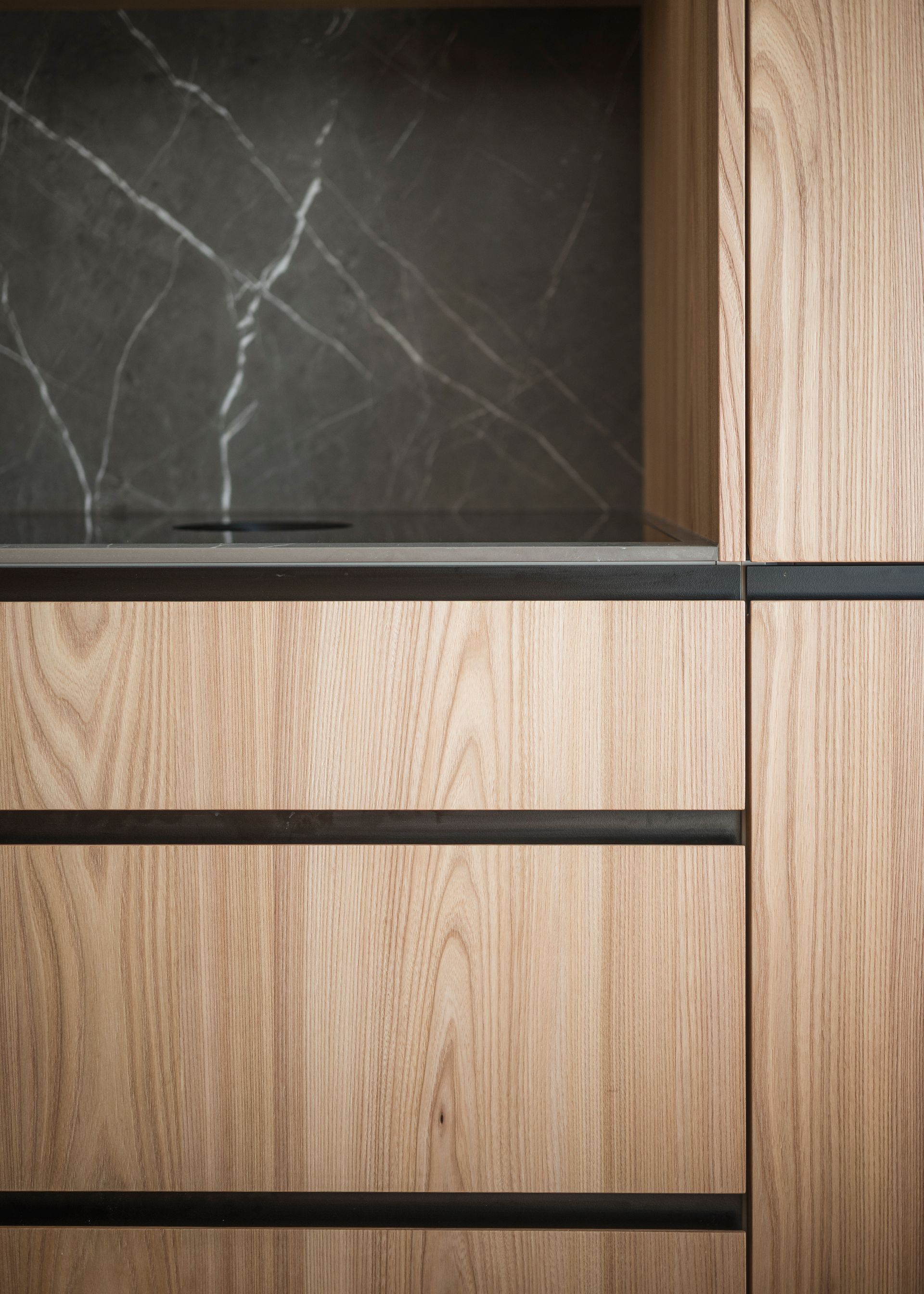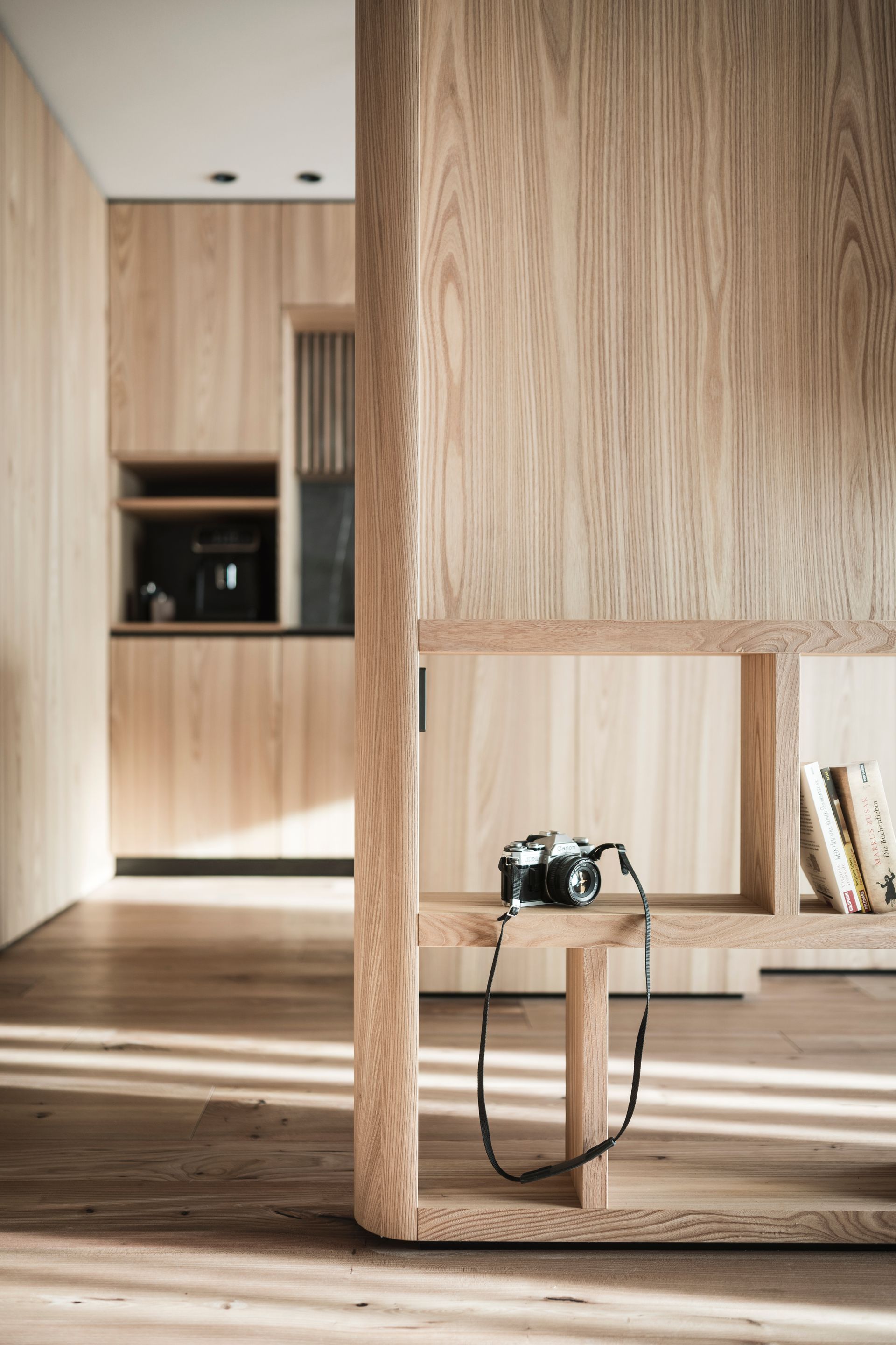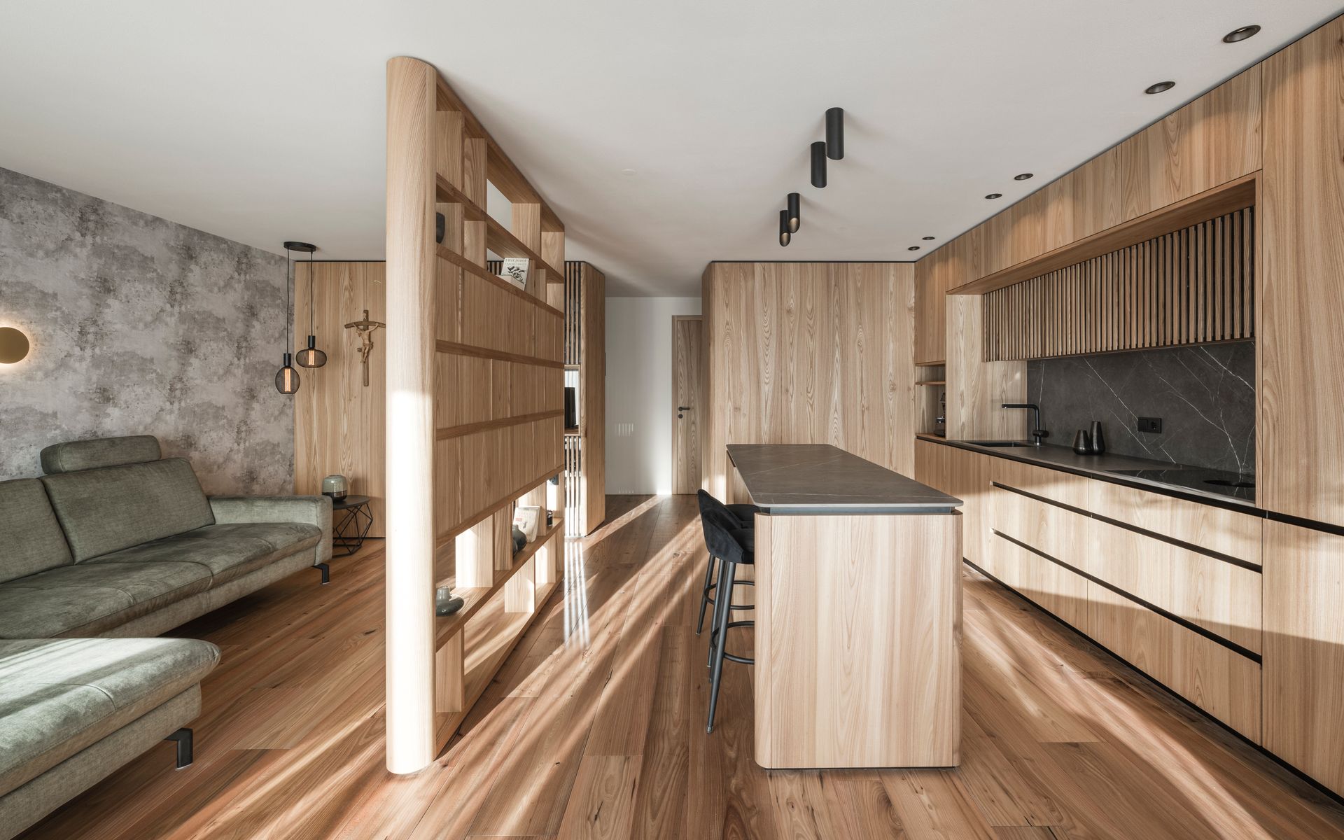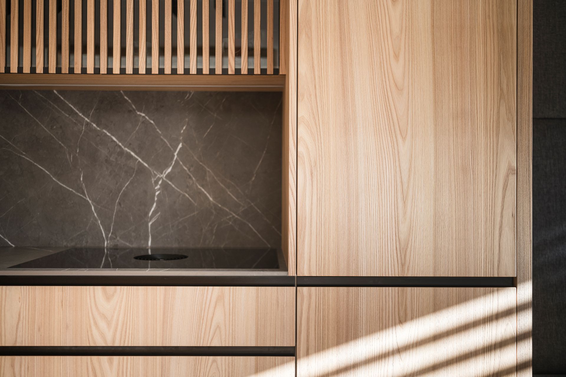 ...interior design einer privatwohnung in ulmenholz, in kombination mit edlen textilien in grau und goldelementen.