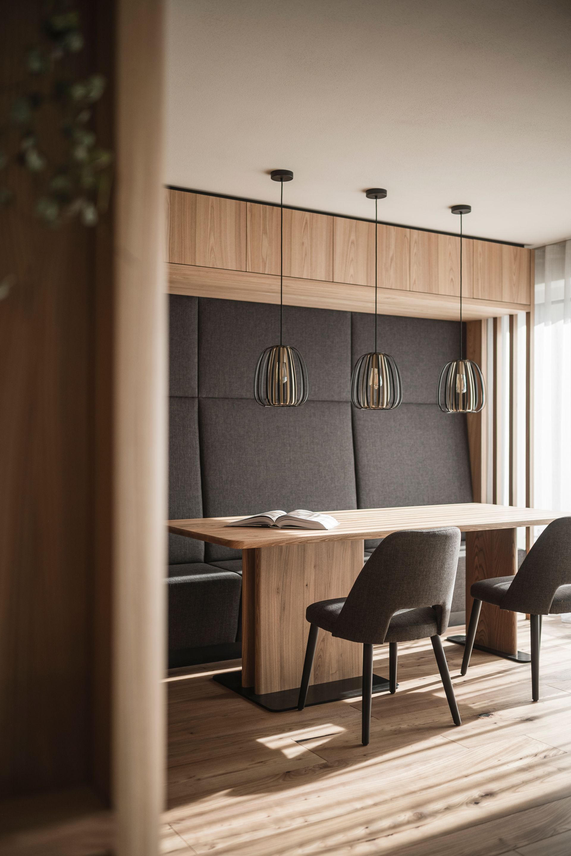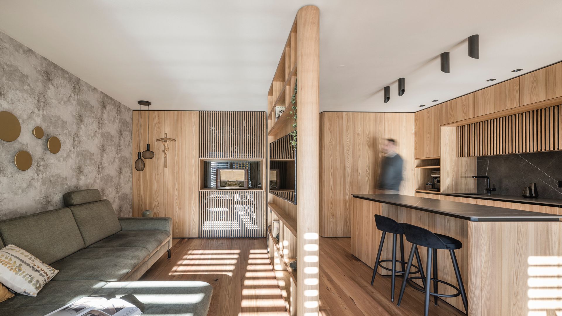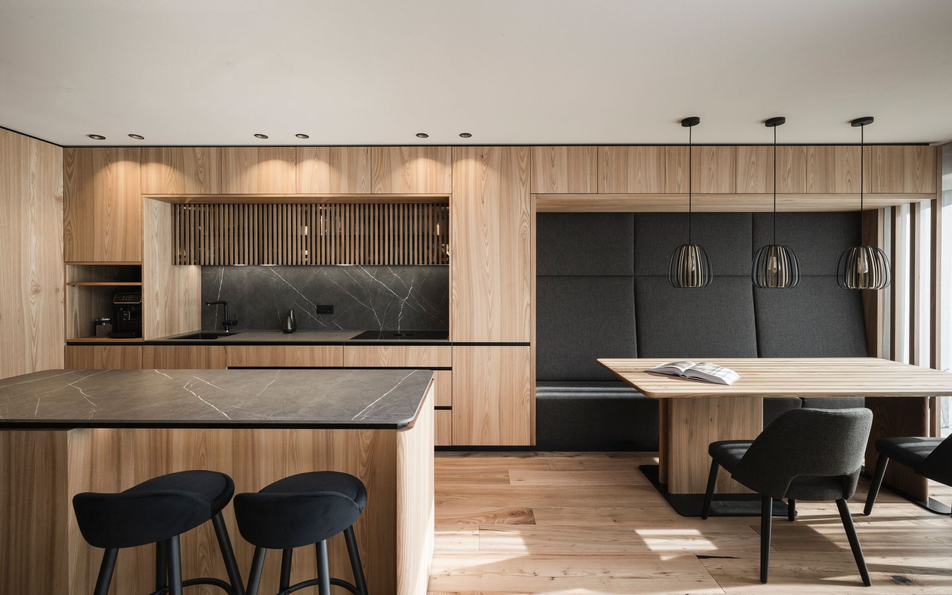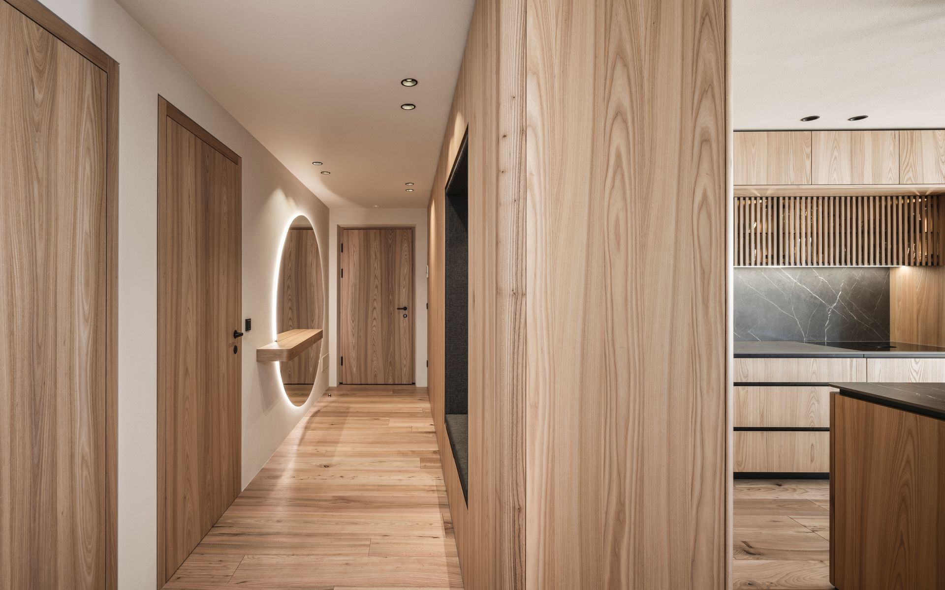 ...interior design einer privatwohnung in ulmenholz, in kombination mit edlen textilien in grau und goldelementen.