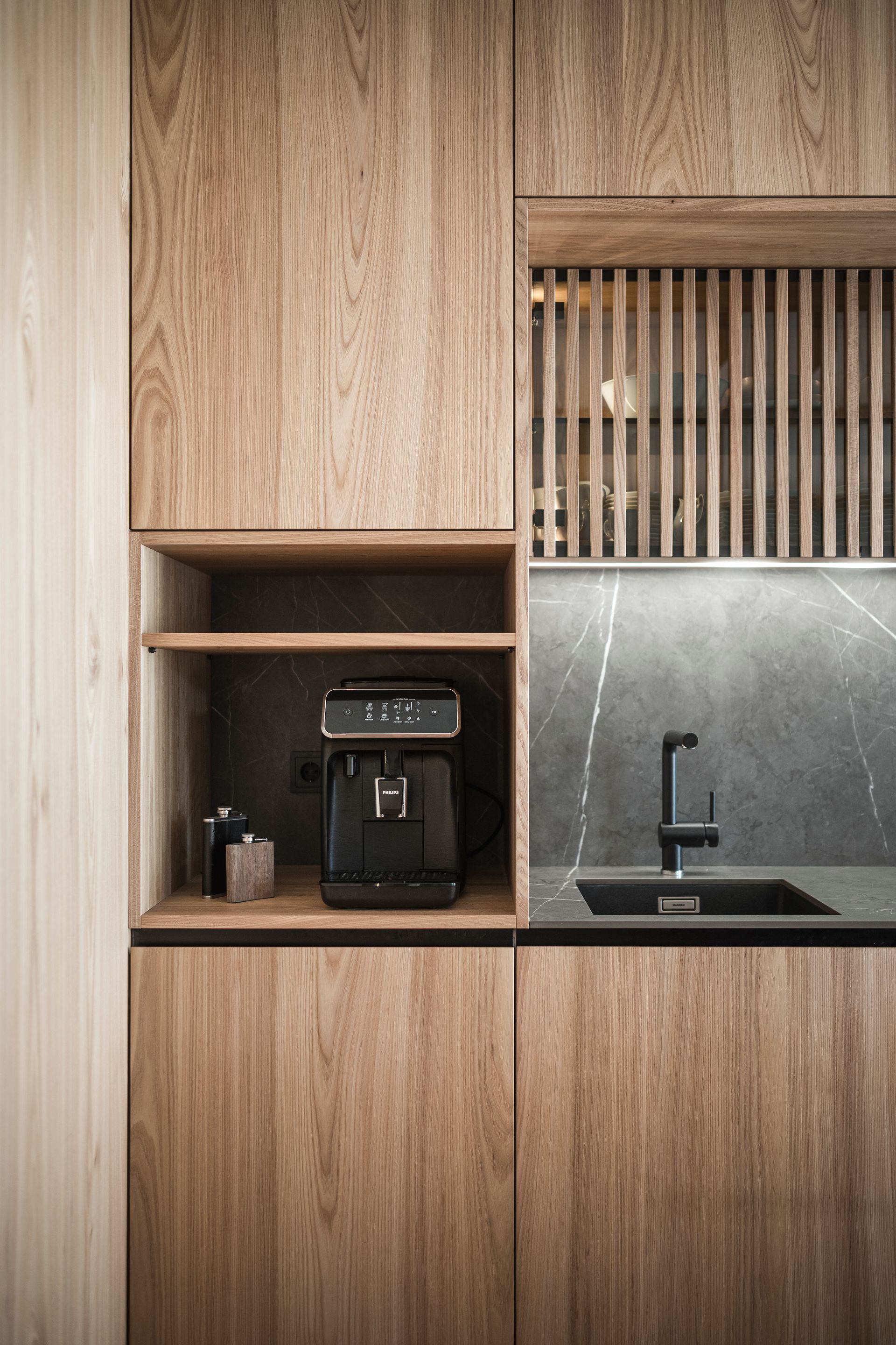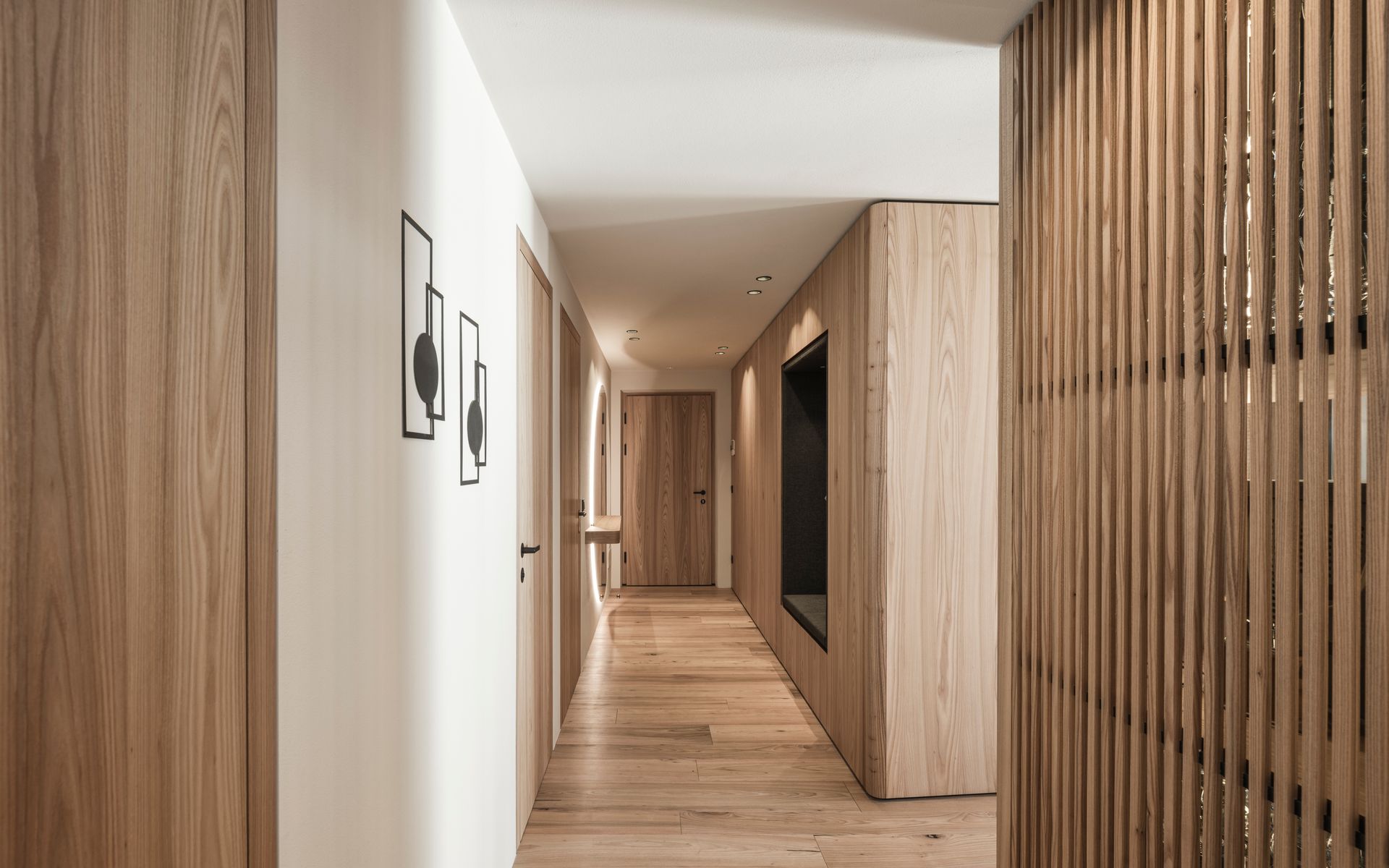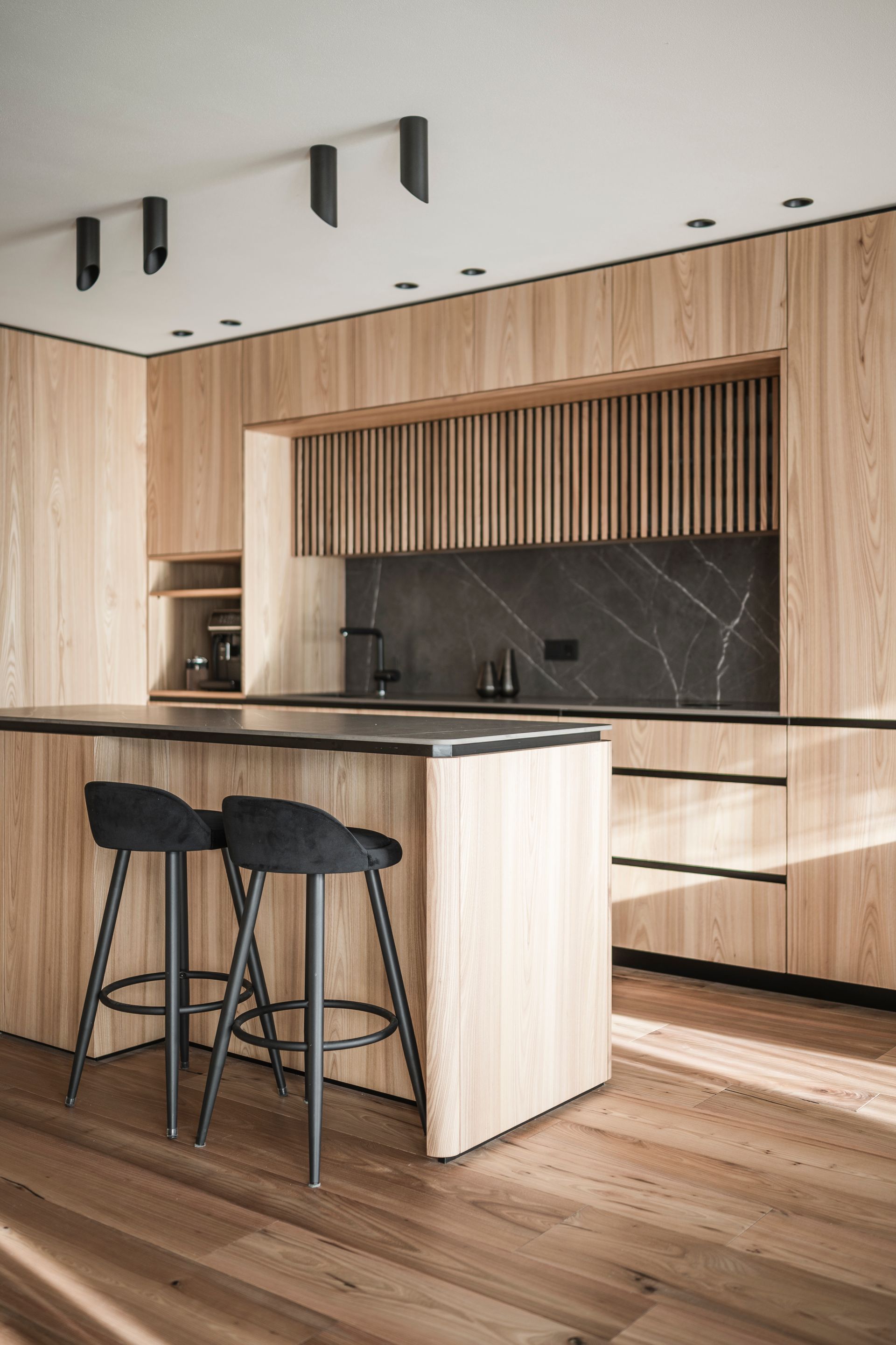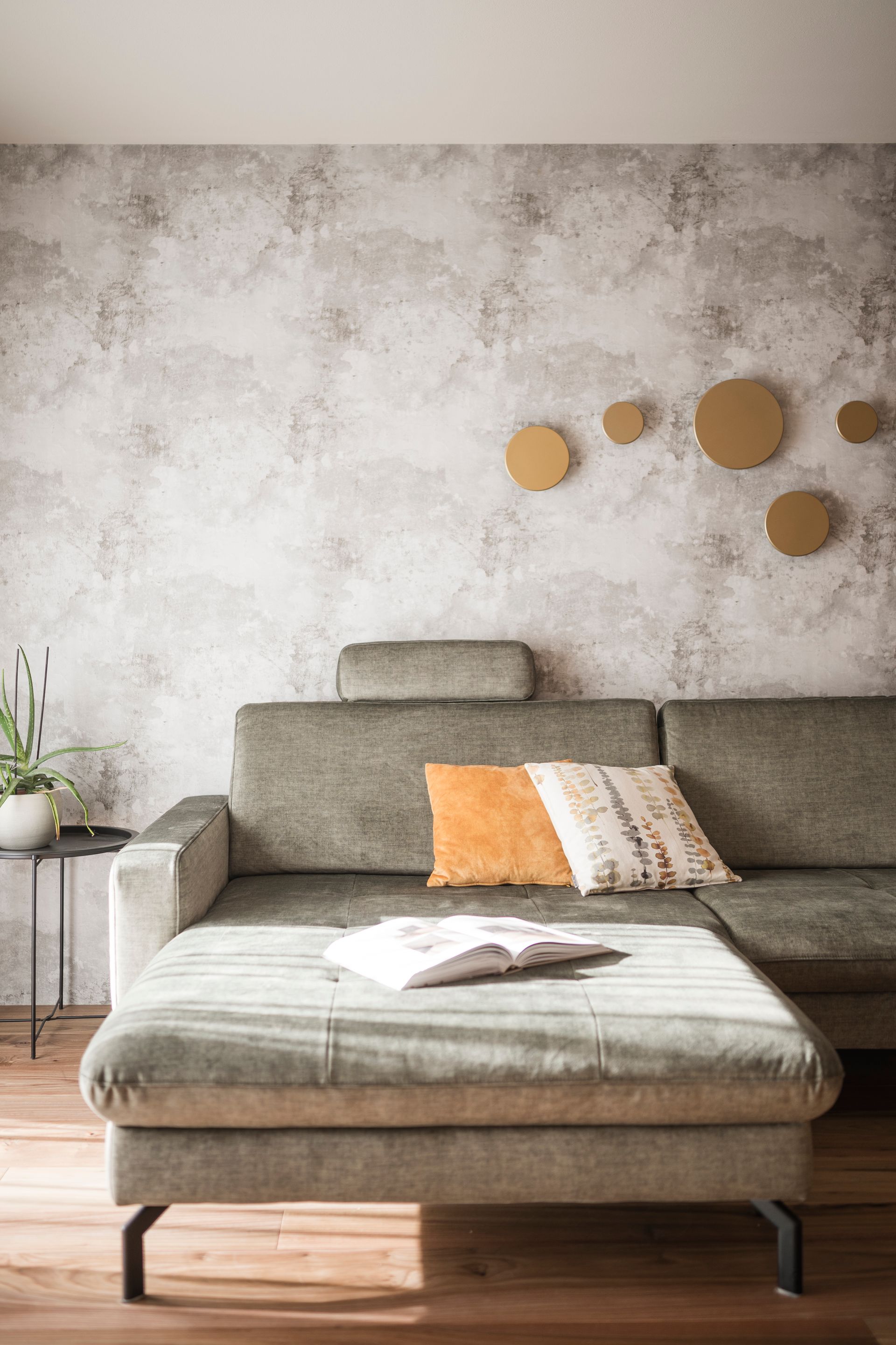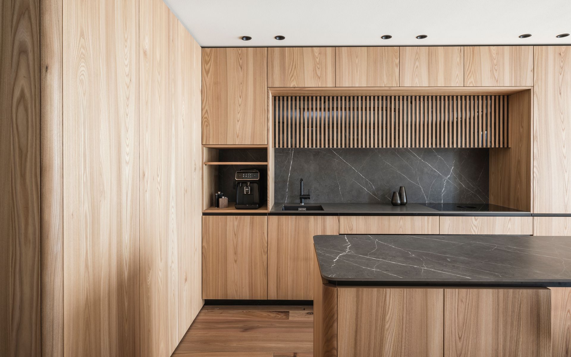 ...interior design einer privatwohnung in ulmenholz, in kombination mit edlen textilien in grau und goldelementen.