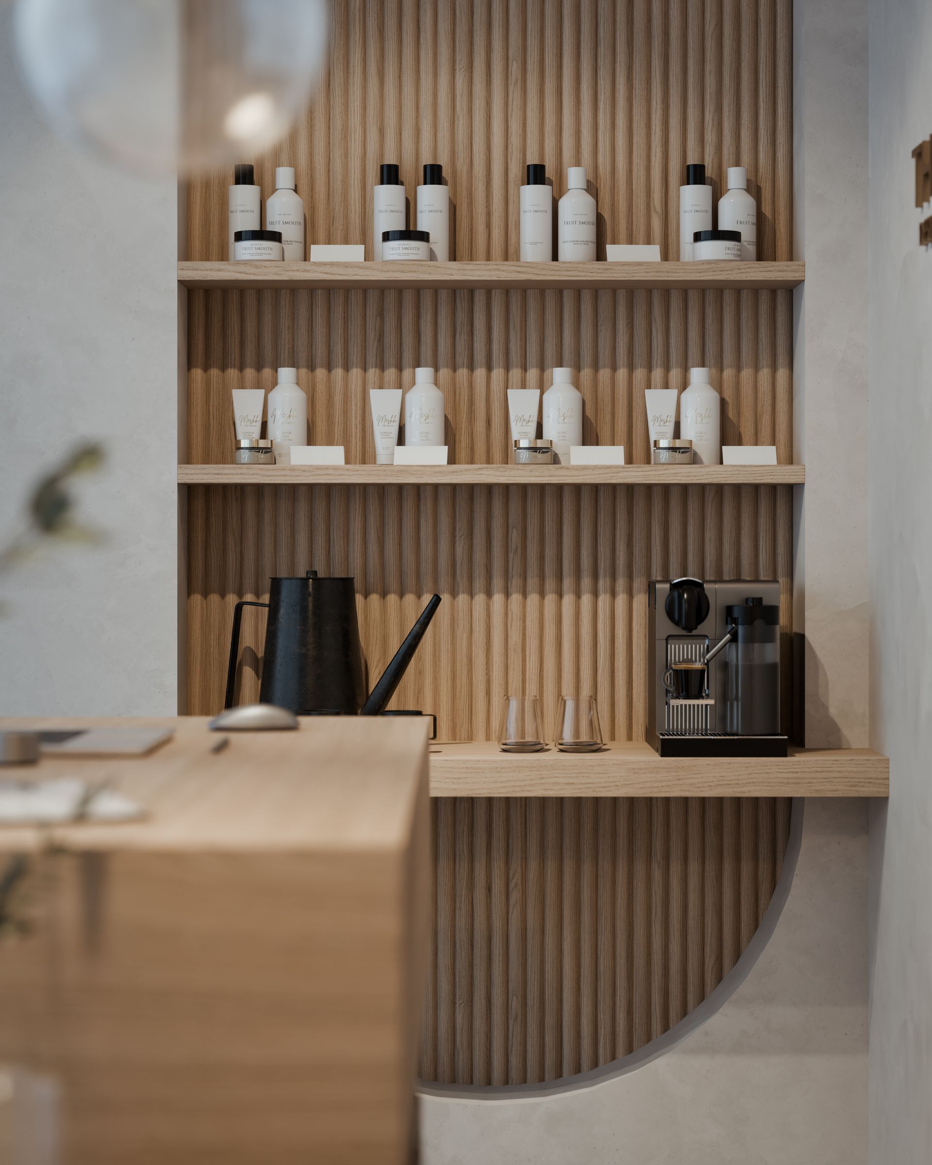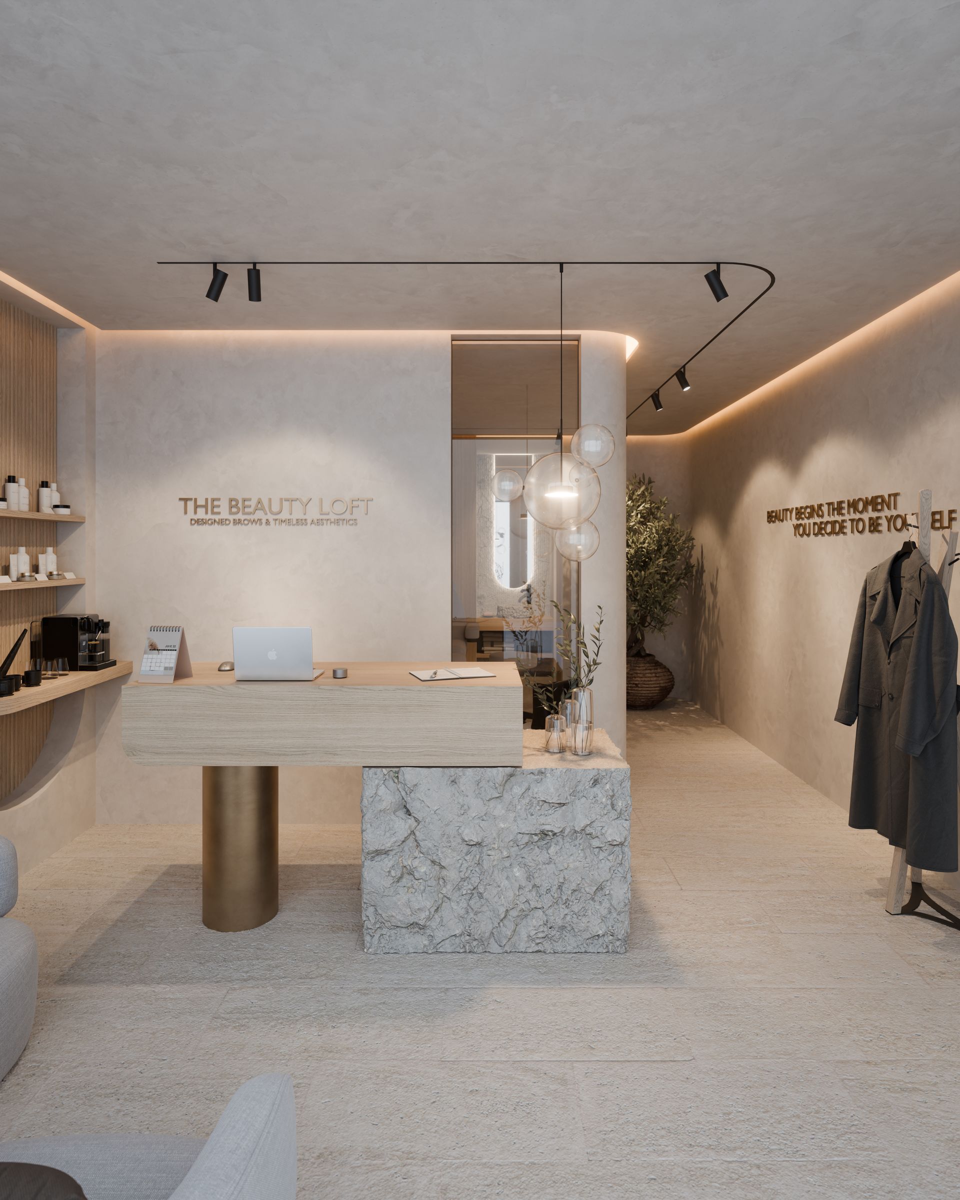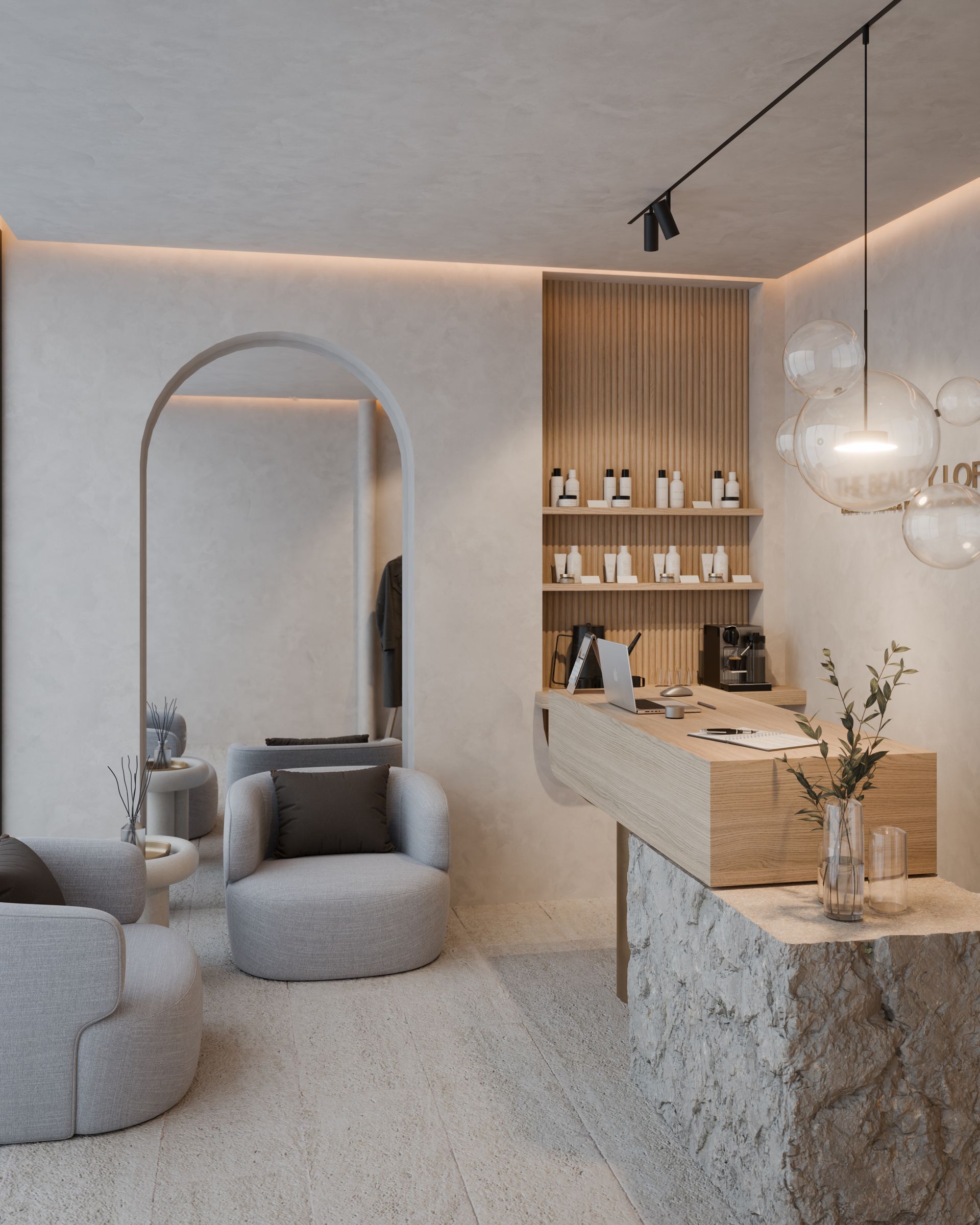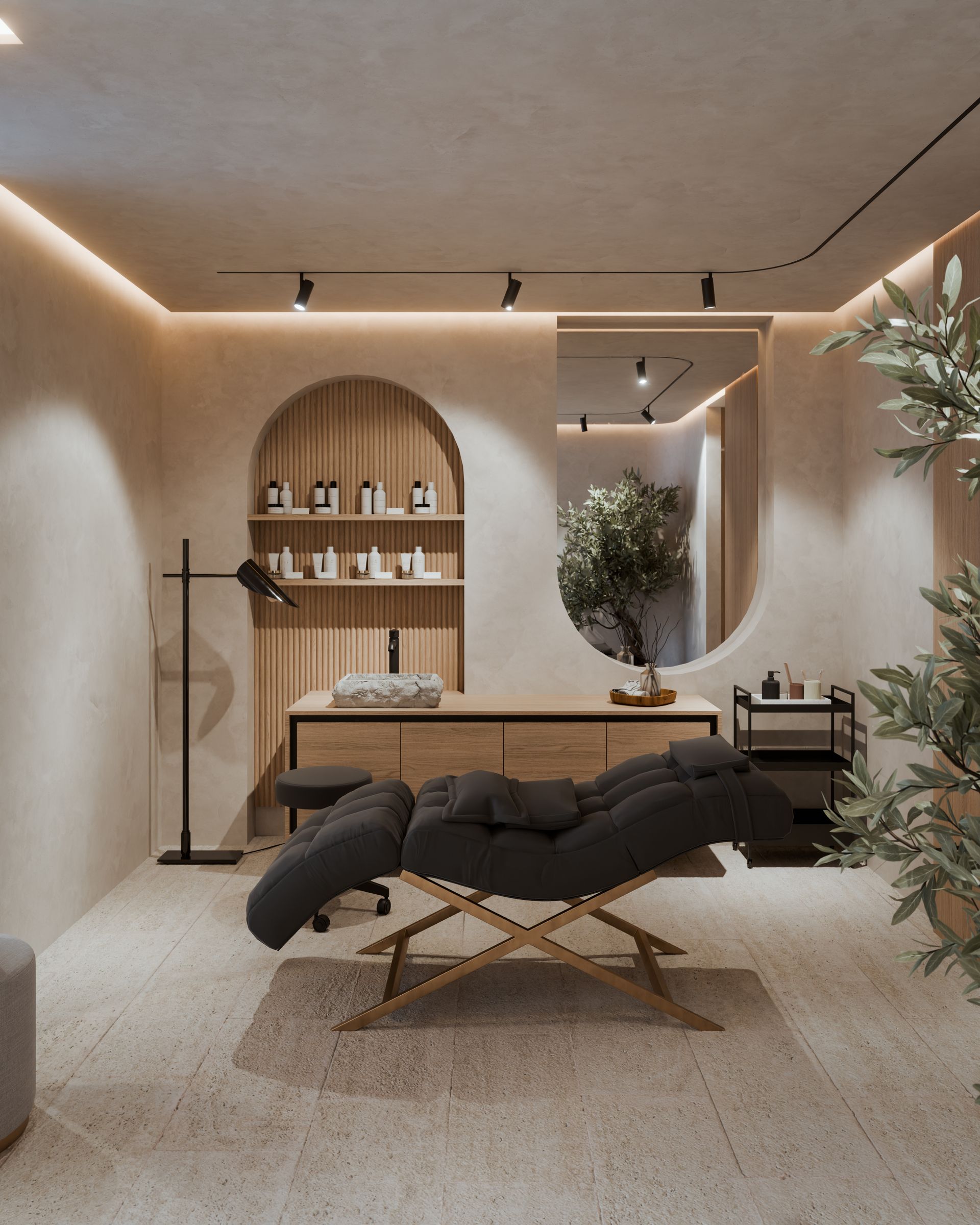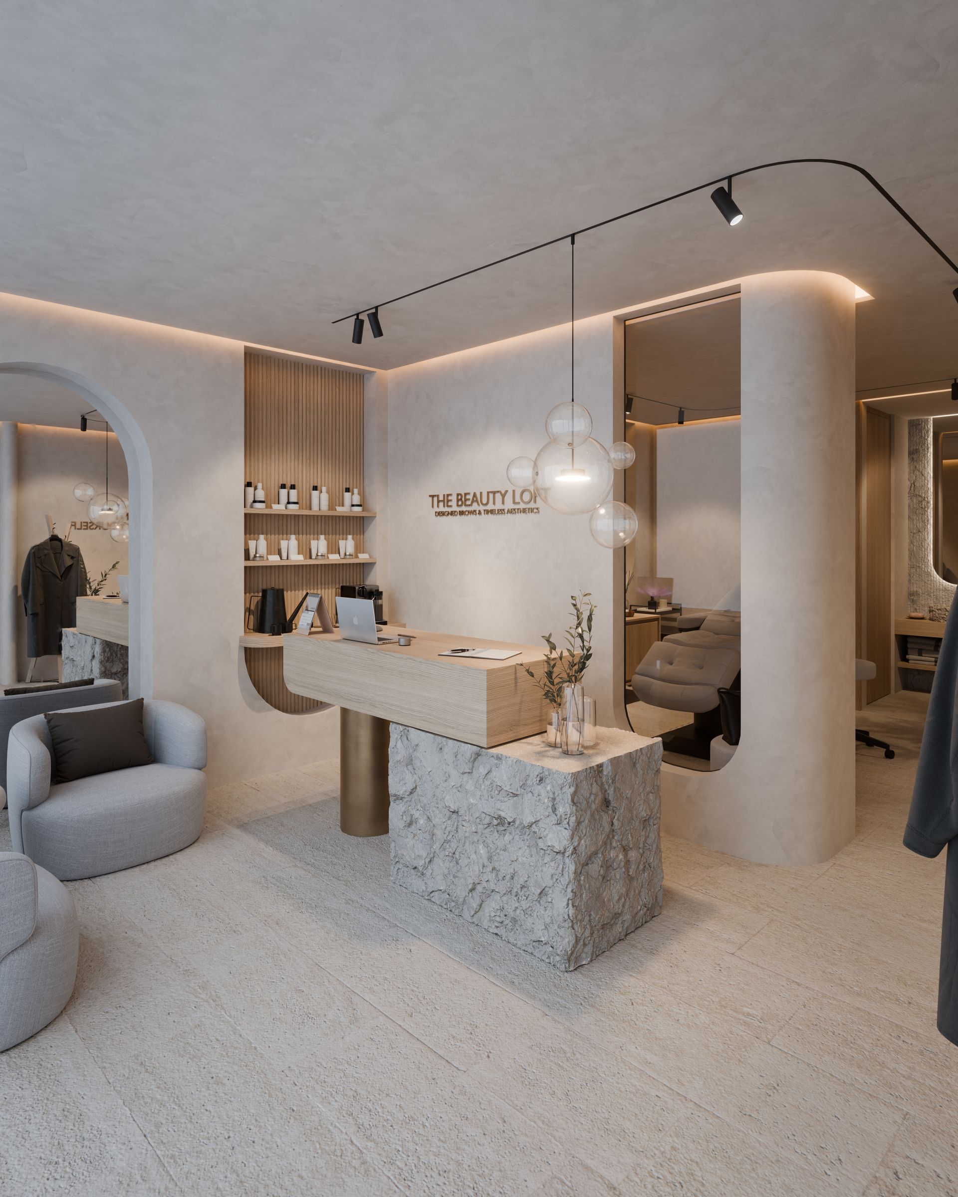...eines beauty salons, der ein gefühl von urlaub und entspannung vermittelt. der südländisch inspirierte stil lebt von gespachtelten wänden, sanften rundungen und einer warmen, natürlichen farbwelt.