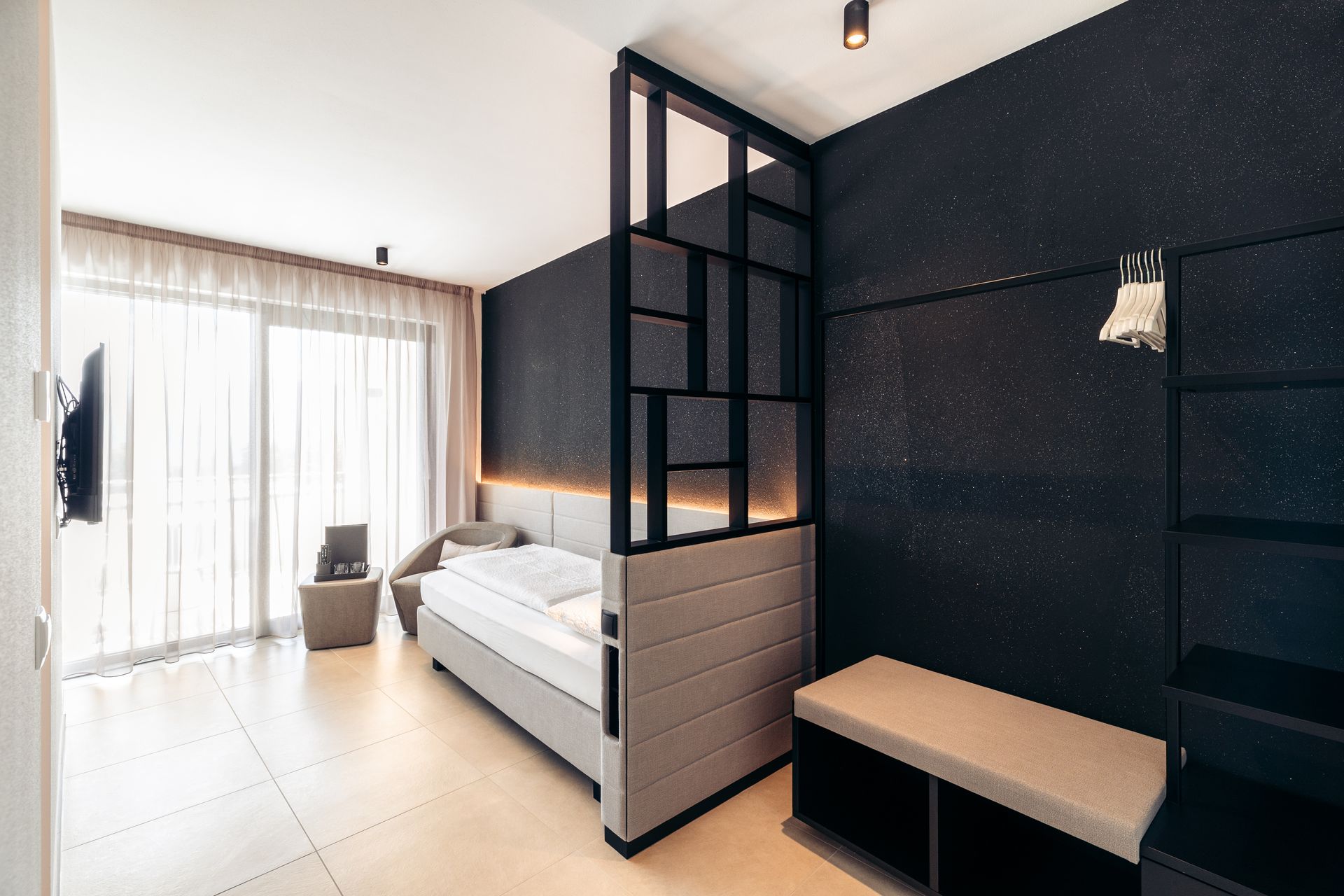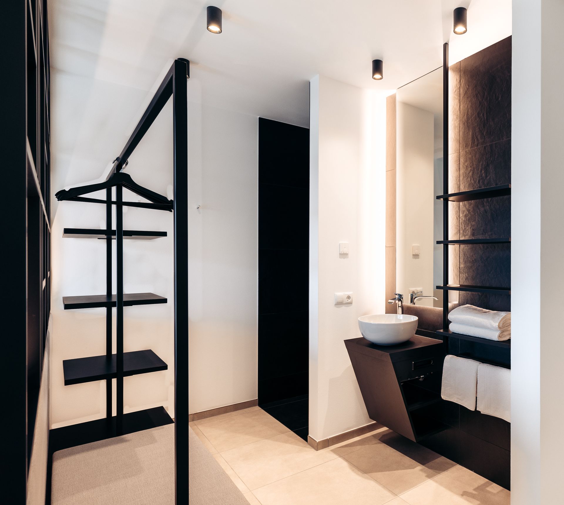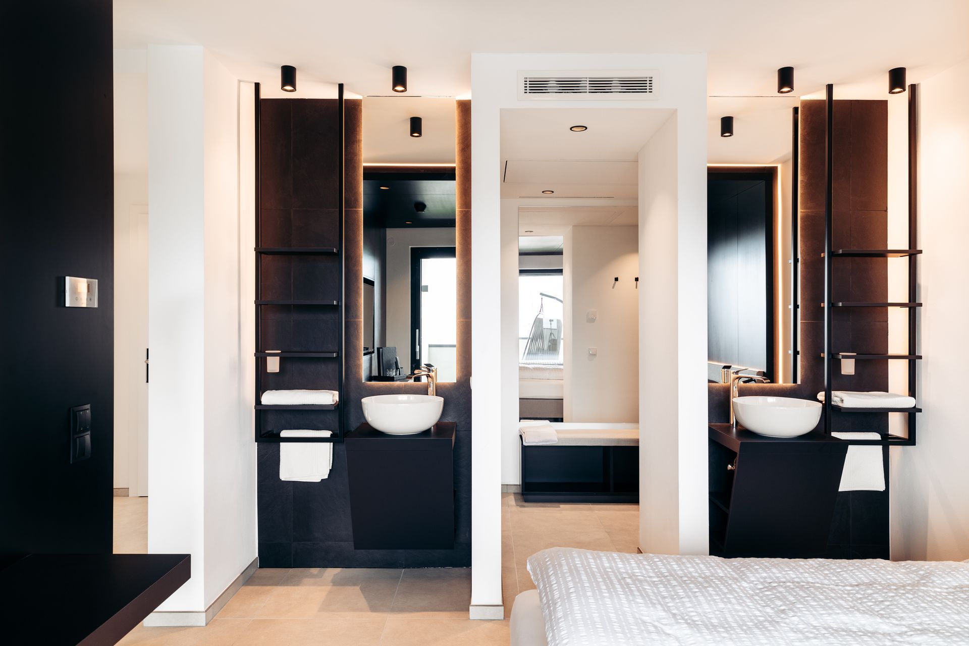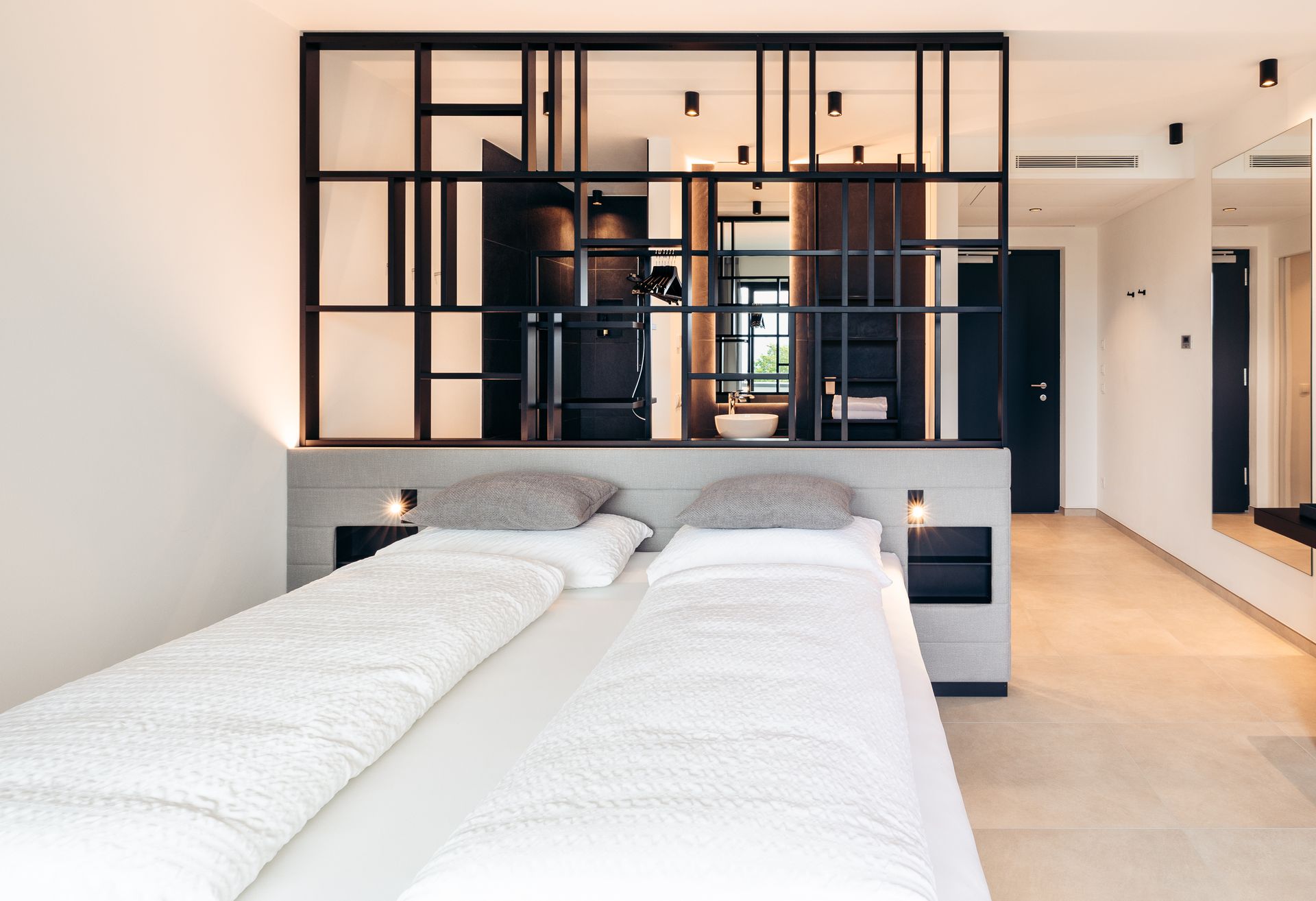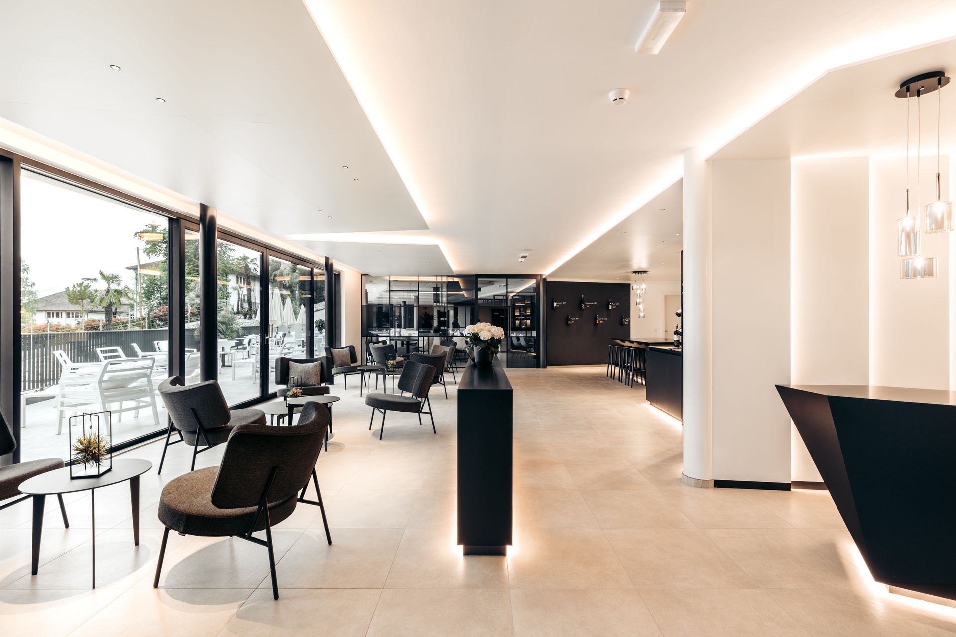 ... des öffentlichen bereiches und der zimmer in linearer formensprache und zeitlosen schwarz, weiss farben.