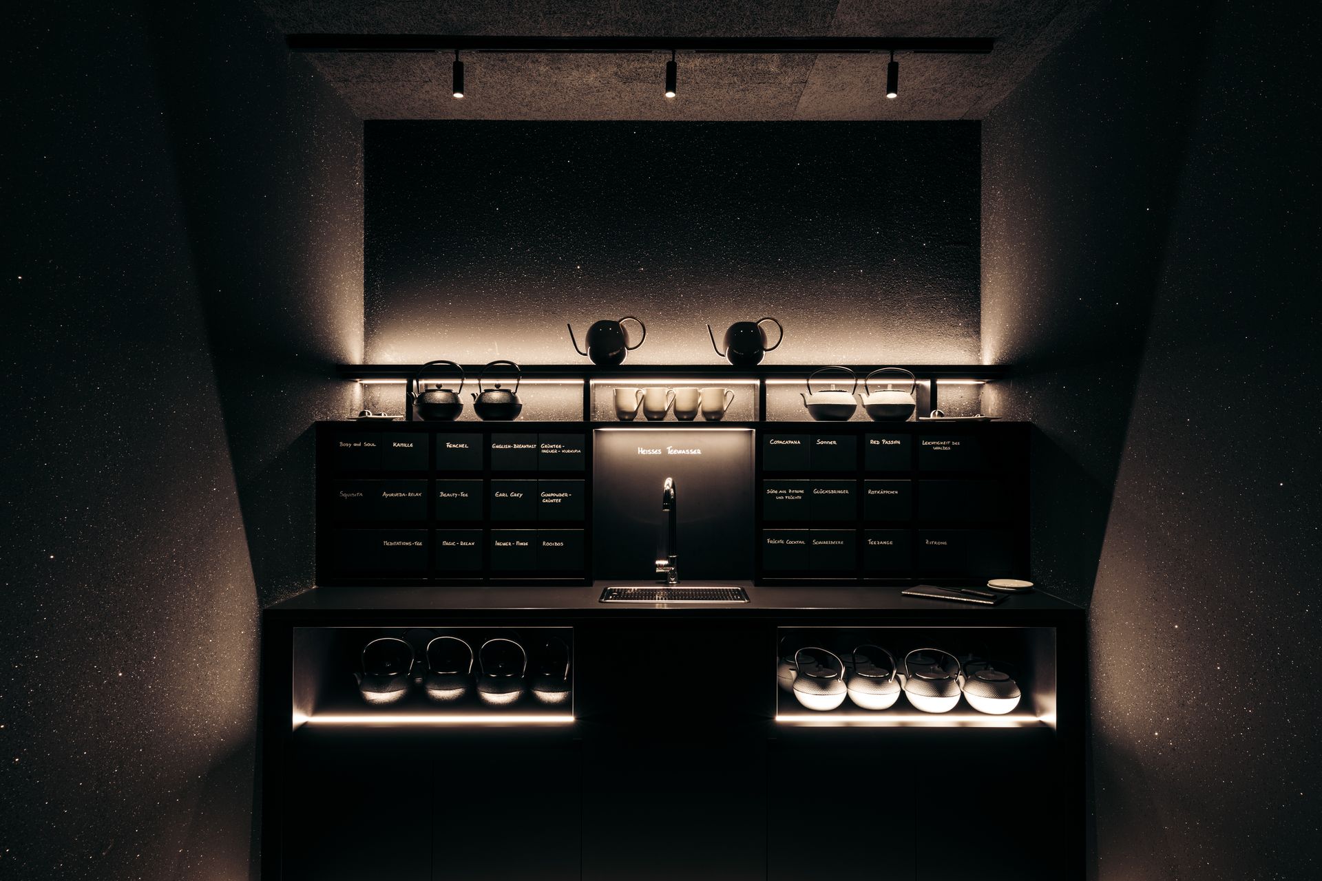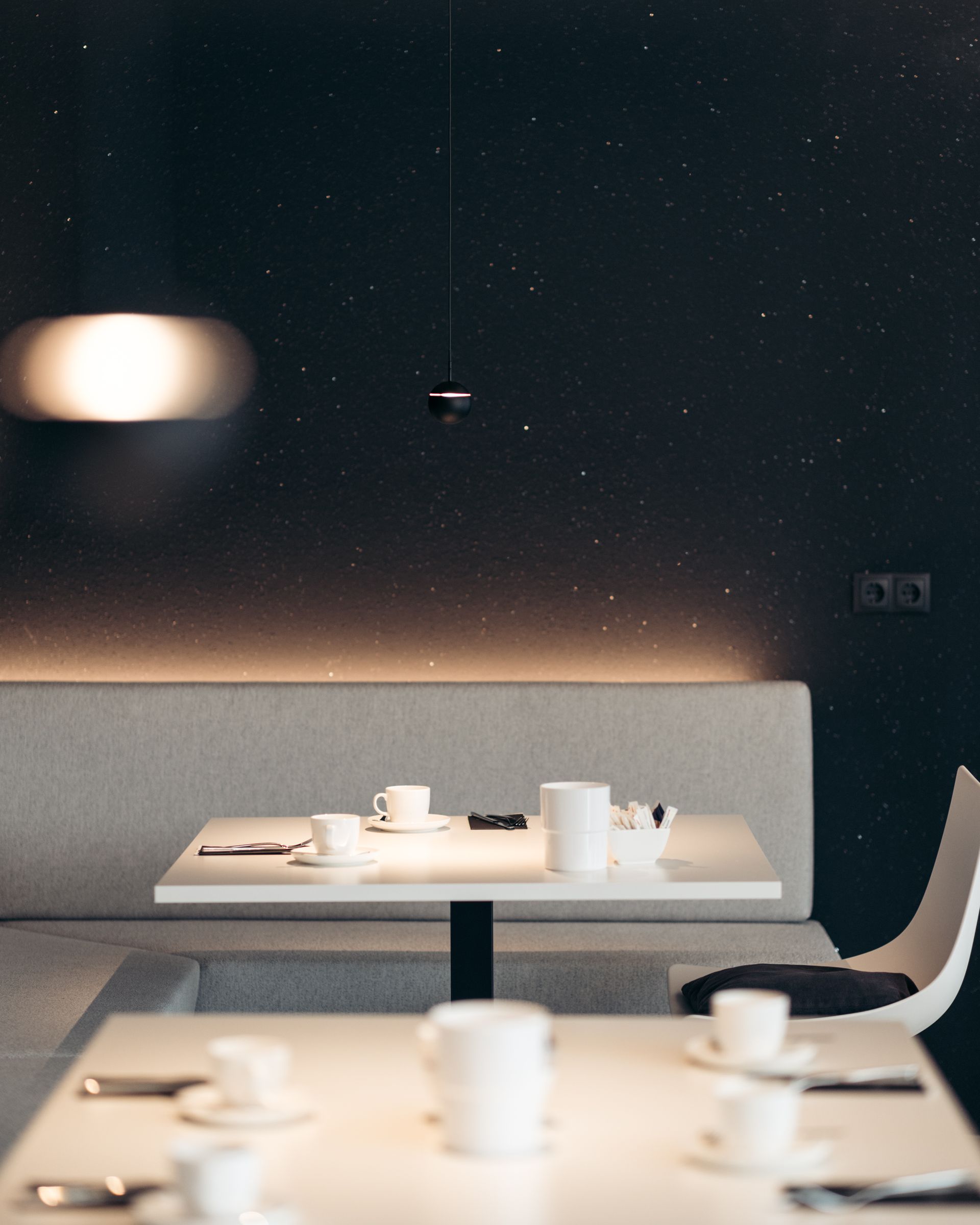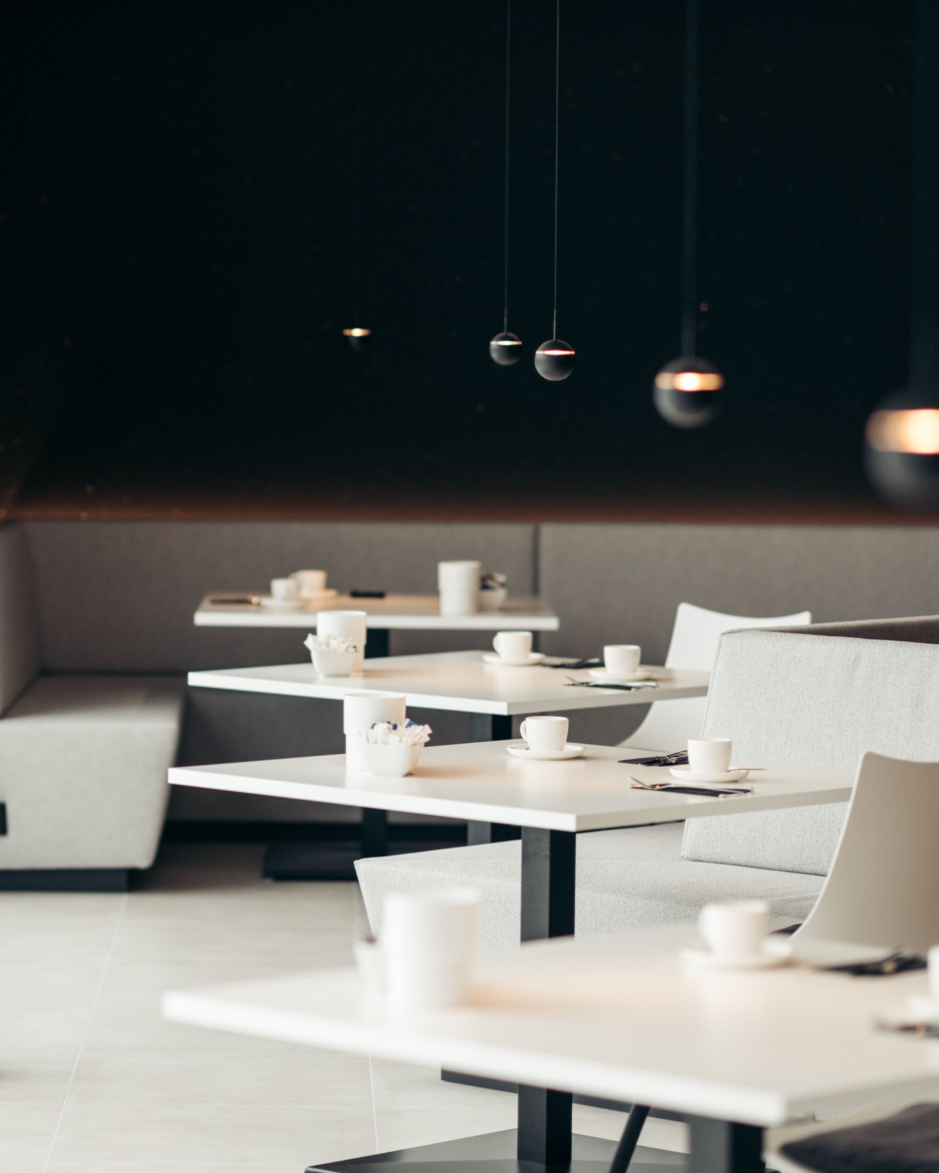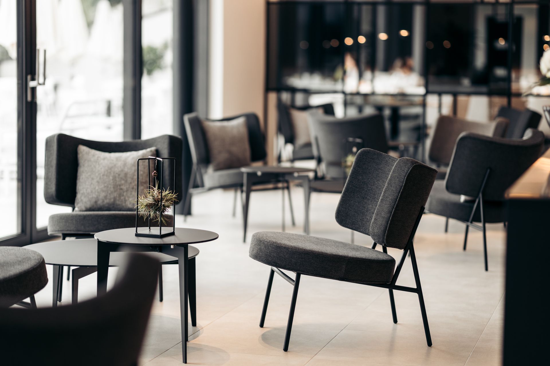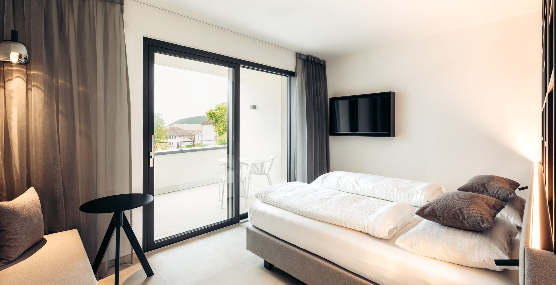 ... des öffentlichen bereiches und der zimmer in linearer formensprache und zeitlosen schwarz, weiss farben.